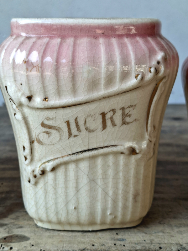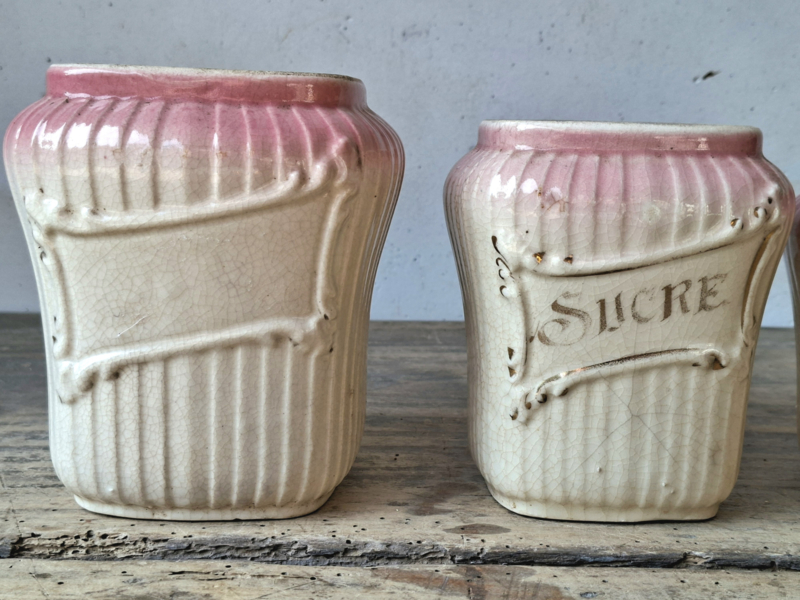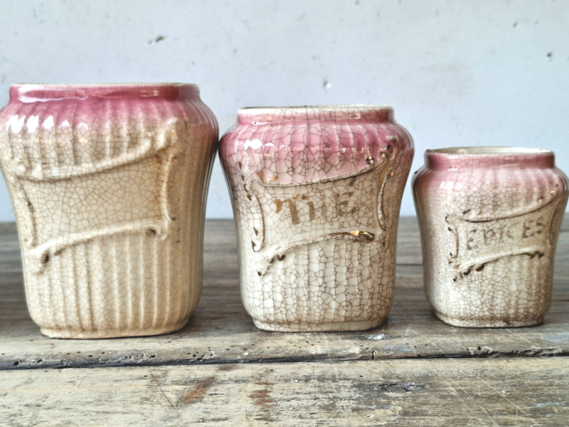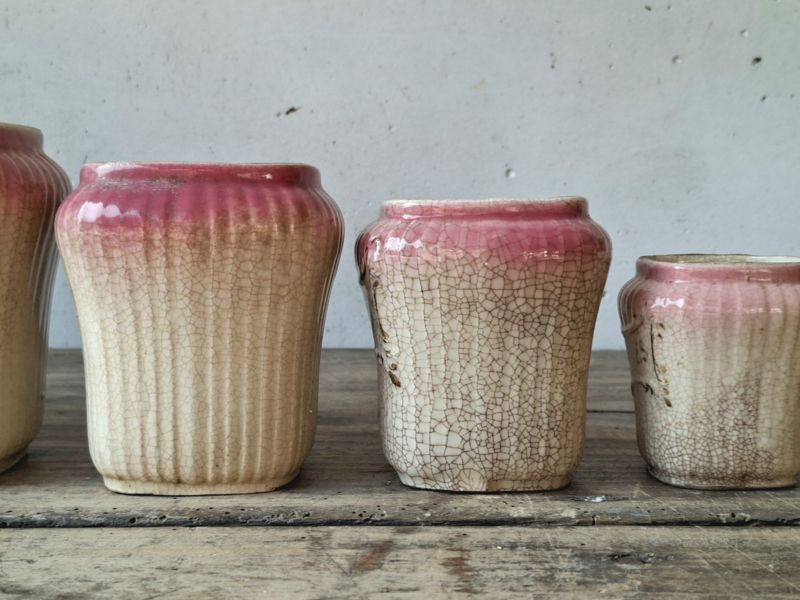 Set franse aardewerk potjes. Van oorsprong hebben ze een deksel, zonder zijn ze ook prachtig. Ze zijn al zo oud dat de leeftijd goed te zien is. Het glazuur is gecraqueleerd en het aardewerk beboterd.