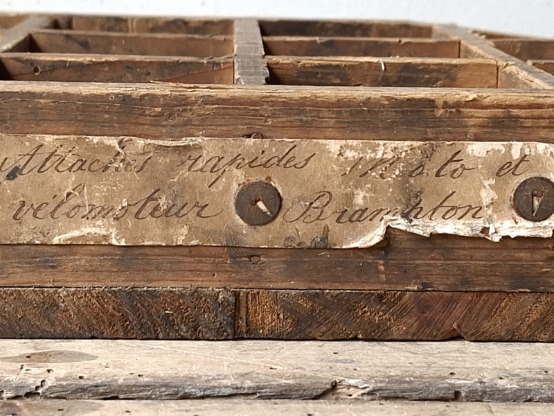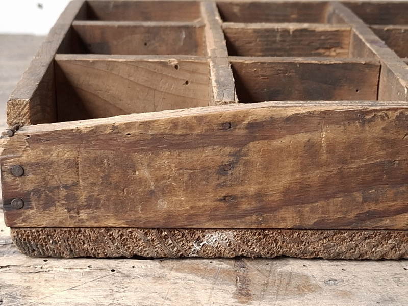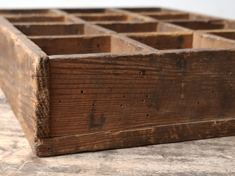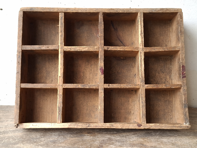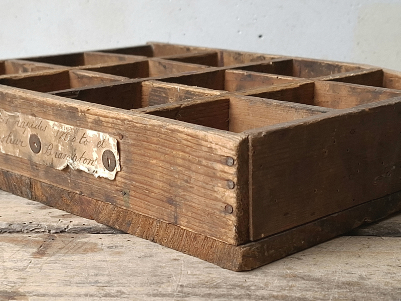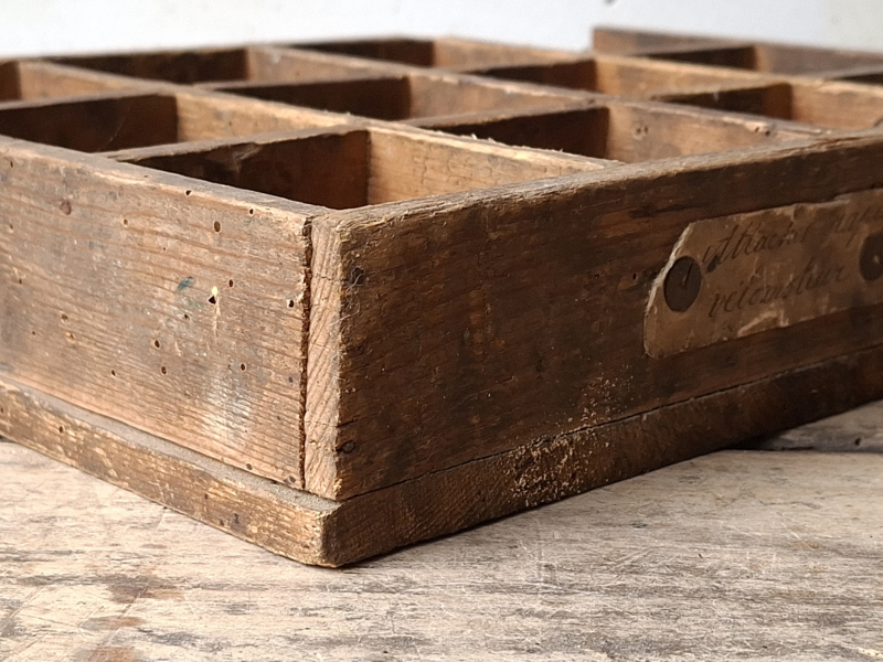 Artikelnummer: 251006Oud vakkenbakje uit Frankrijk. Dit vakkenbakje komt uit een garage. Het bakje heeft het originele label wat er ooit aan bevestigd is, het is mooi meeverouderd. Er zijn oude donkere houtwormgaatjes, voor zover mogelijk preventief behandeld.