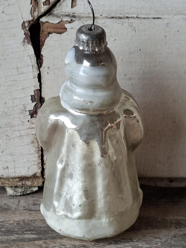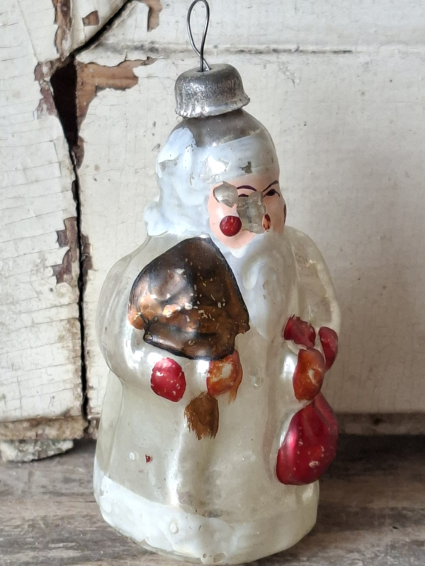 Oude vintage kerstbal, kerstman. De verf is geleefd verouderd, onder de dop is het glas wat gerafeld.