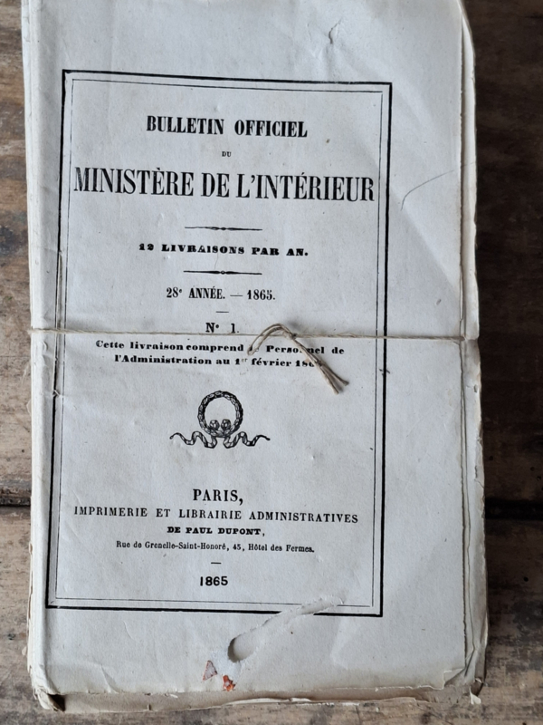 Artikelnummer: 251103Bundel antieke franse bulletins uit 1865. Deze bulletins zijn mooi doorleefd verouderd. Deze bundel van het Ministère de L'Interieur Paris is mooi als decoratie, leg het als stapeltje neer.