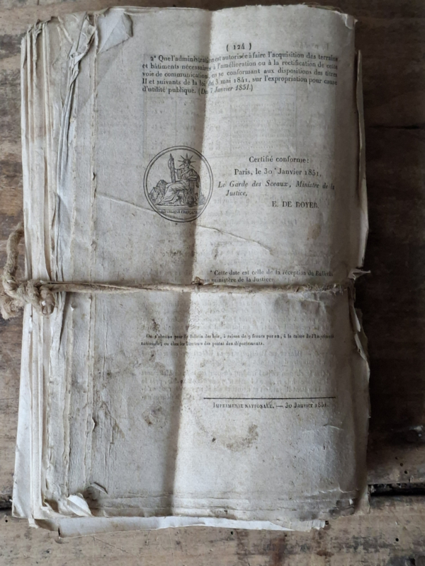 Bundel antieke franse bulletins. Deze bulletins uit 1850 zijn doorleefd verouderd. De bulletins Des Lois zijn mooi als decoratie, leg het als bundel neer.