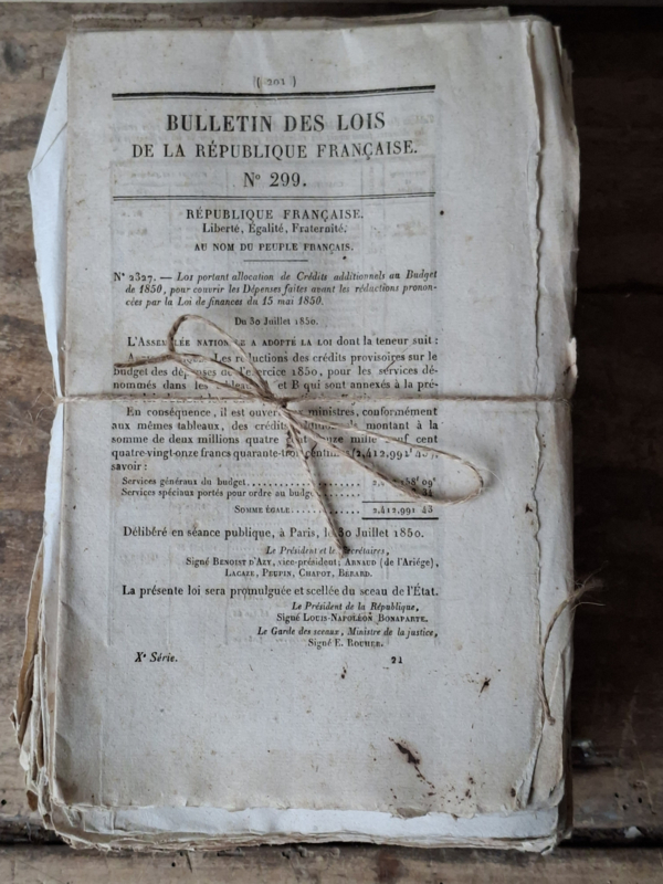 Bundel antieke franse bulletins. Deze bulletins uit 1850 zijn doorleefd verouderd. De bulletins Des Lois zijn mooi als decoratie als stapeltje.