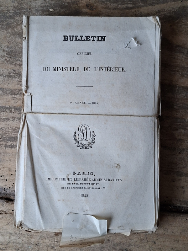 Bundel antieke franse bulletins. Deze bulletins uit 1845 zijn verouderd. De bulletins van Ministère de L'Interieur is als stapeltje mooi als decoratie.