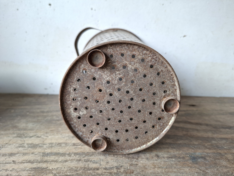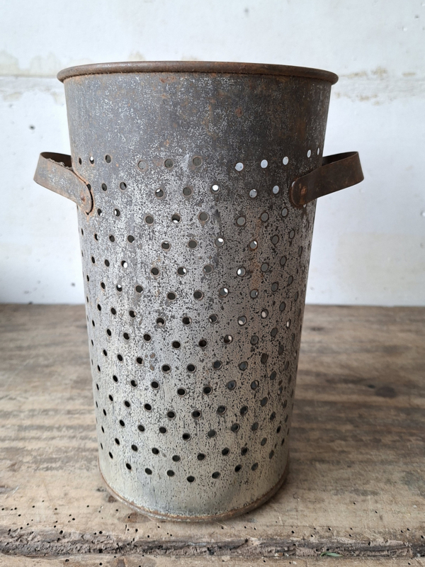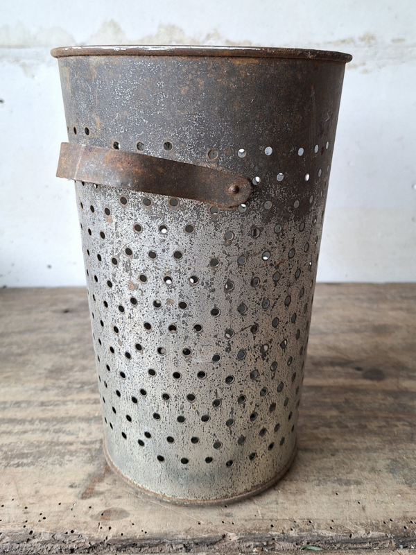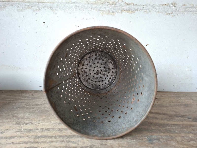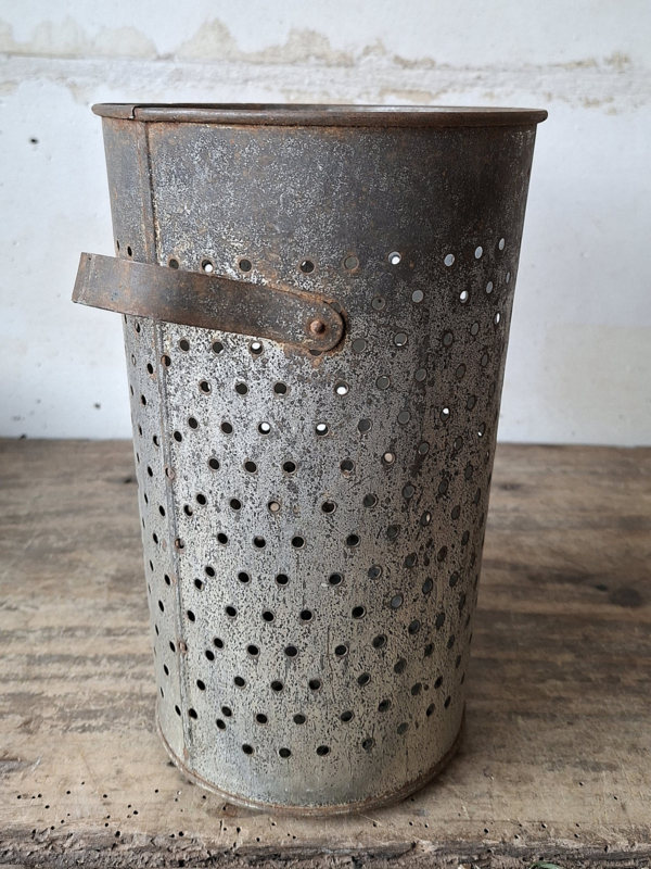 Artikelnummer: 251202Oude hoge grote franse zinken kaasmal. Het zink is mooi verouderd. De kaasmal heeft twee greepjes. Prachtig om een kaars of lichtslingertje op batterijen in te zetten, het licht schijnt mooi door de gaatjes. Ook mooi in de keuken met keukengerei of zet er droogbloemen in.