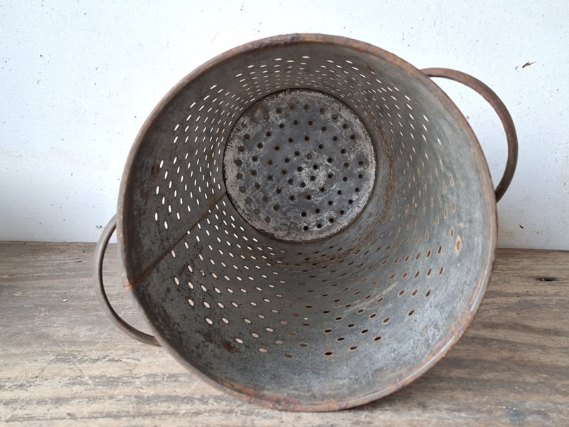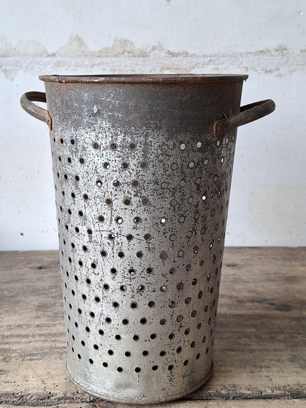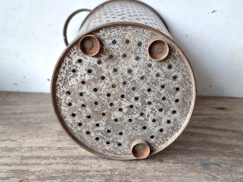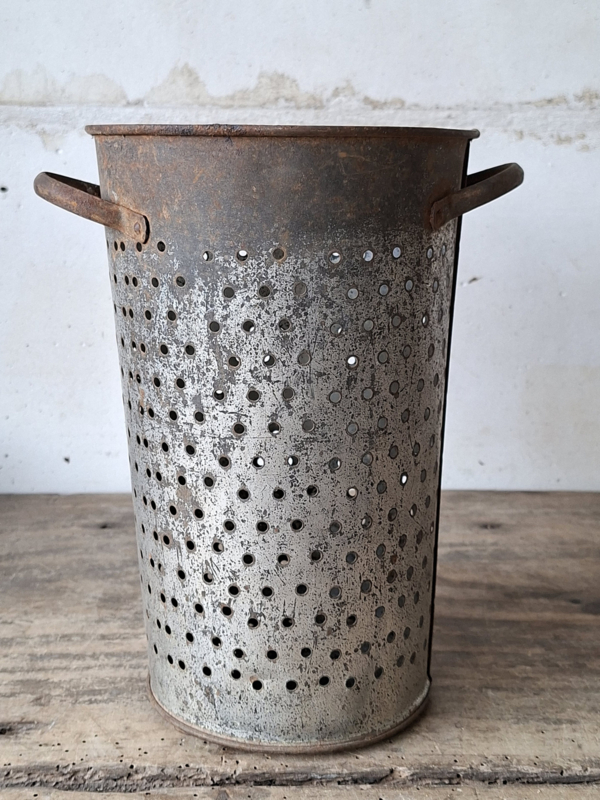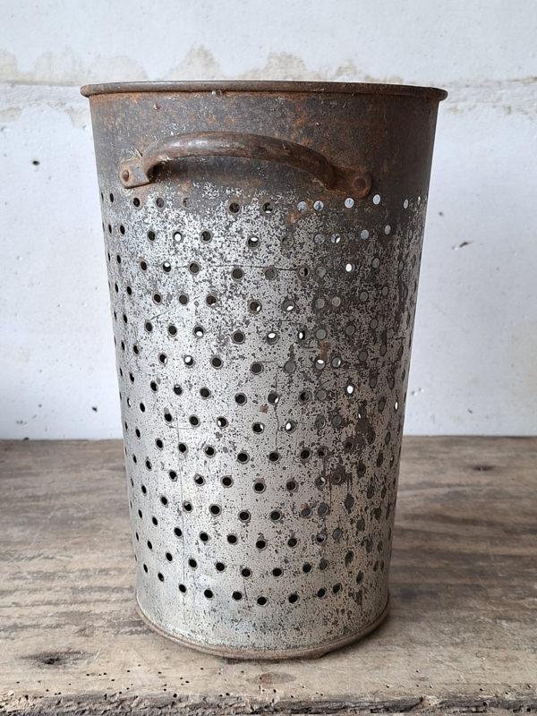 Artikelnummer: 251201Oude hoge grote franse zinken kaasmal. Het zink is mooi verouderd. De kaasmal heeft twee grepen. Prachtig om een kaars of lichtslingertje op batterijen in te zetten, het licht schijnt mooi door de gaatjes. Ook mooi in de keuken met keukengerei of zet er droogbloemen in.
