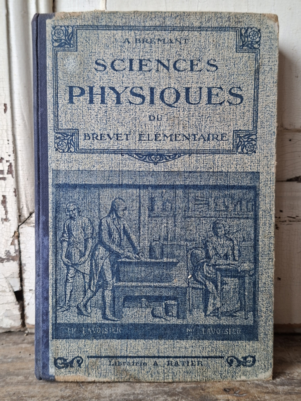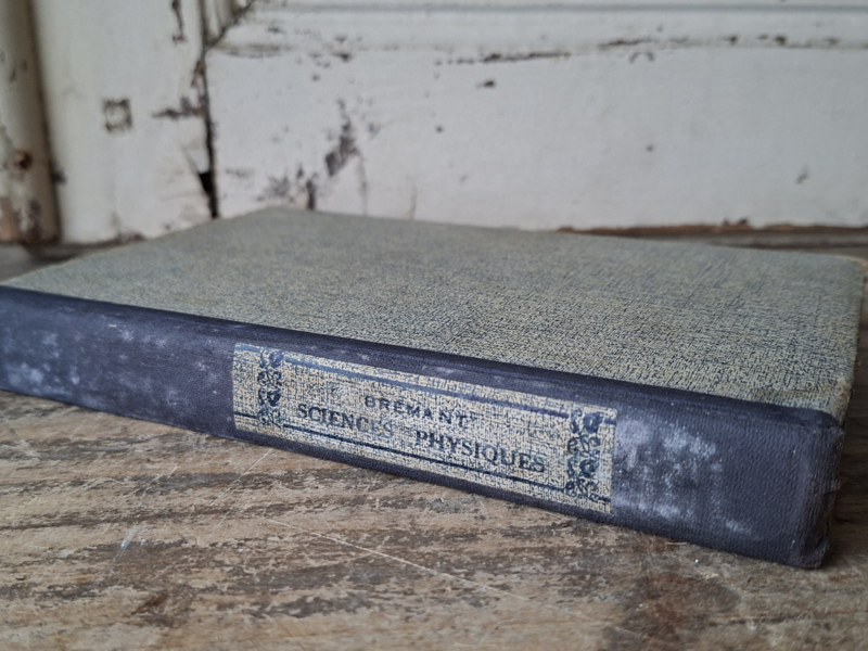 Oud inmiddels antiek frans Scienes Physiques (natuurwetenschappen) school leerboek met harde kaft. De kaft is op plekjes geleefd. Het boekje is geleefd en verouderd. Oude franse boekjes zijn prachtig als decoratie.