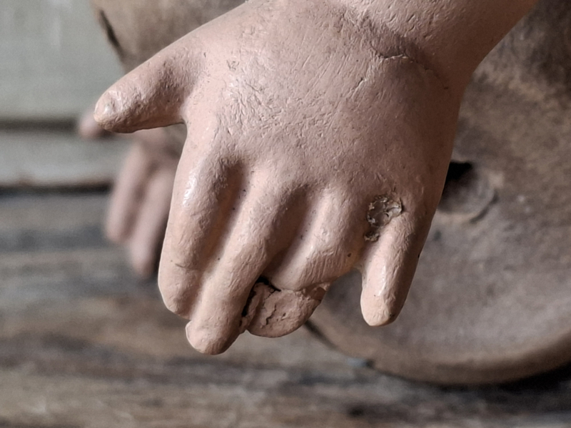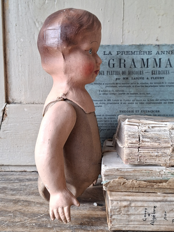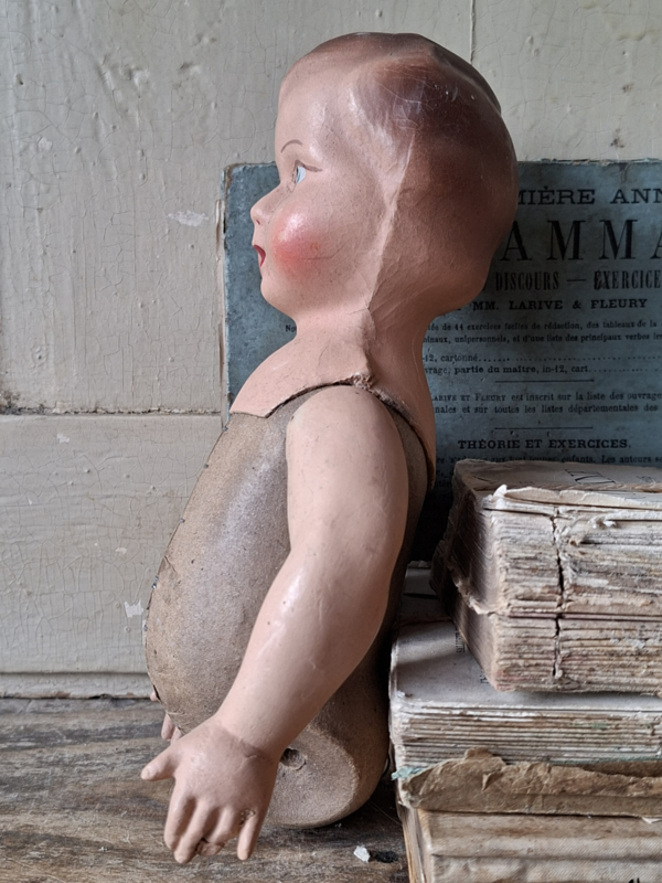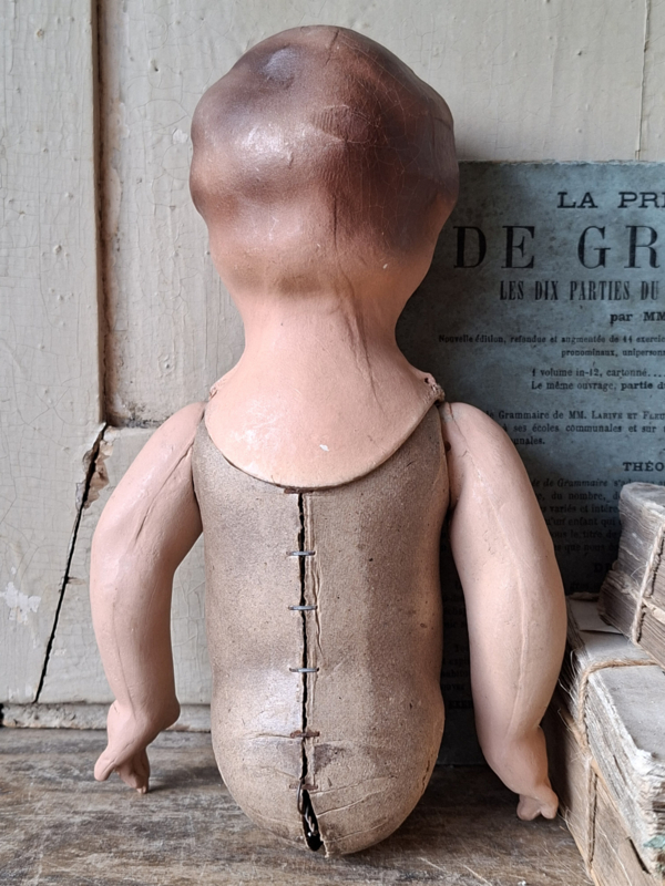 Oud poppenlijfje uit Frankrijk. Mooi handgeschilderd, de armpjes kunnen draaien. Deze lijfjes werden gebruikt om geboortepoppen te maken, ze werden cadeau gegeven bij een geboorte.