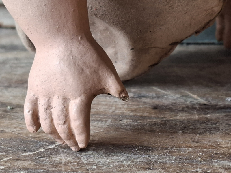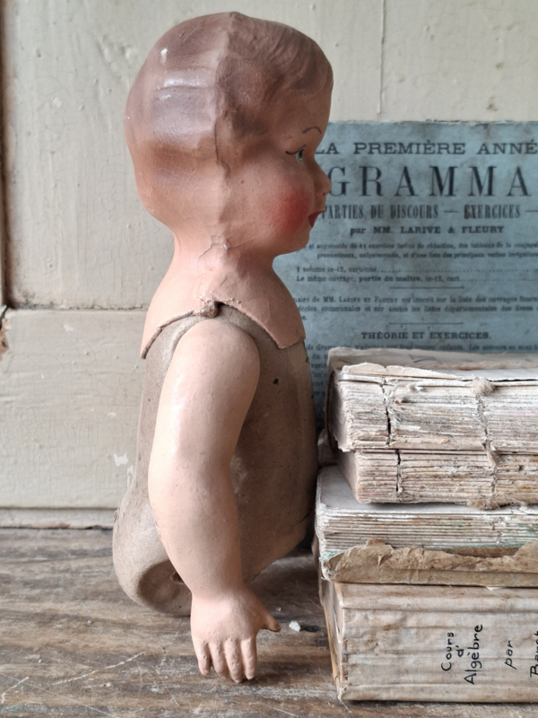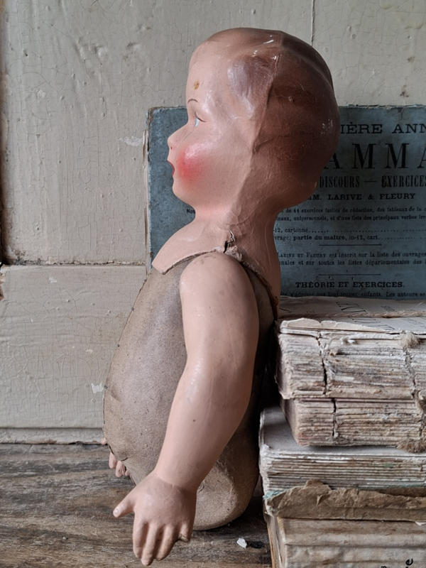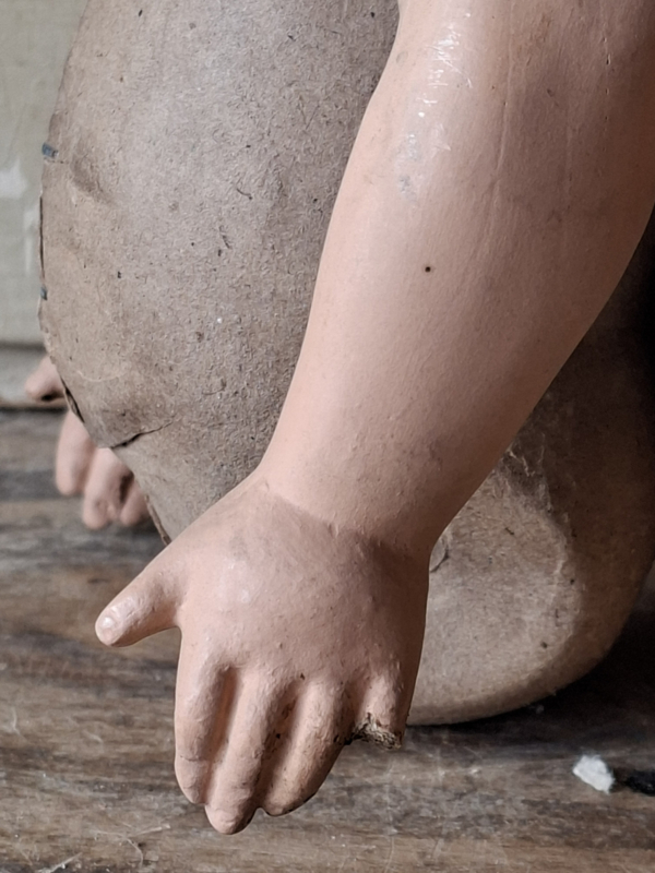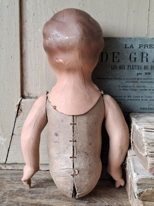 Oud poppenlijfje uit Frankrijk. Mooi handgeschilderd, de armpjes kunnen draaien. Deze lijfjes werden gebruikt om geboortepoppen te maken, ze werden cadeau gegeven bij een geboorte. Aan één handje is het duimpje aangedaan, aan het andere handje het pinkje.