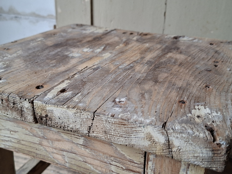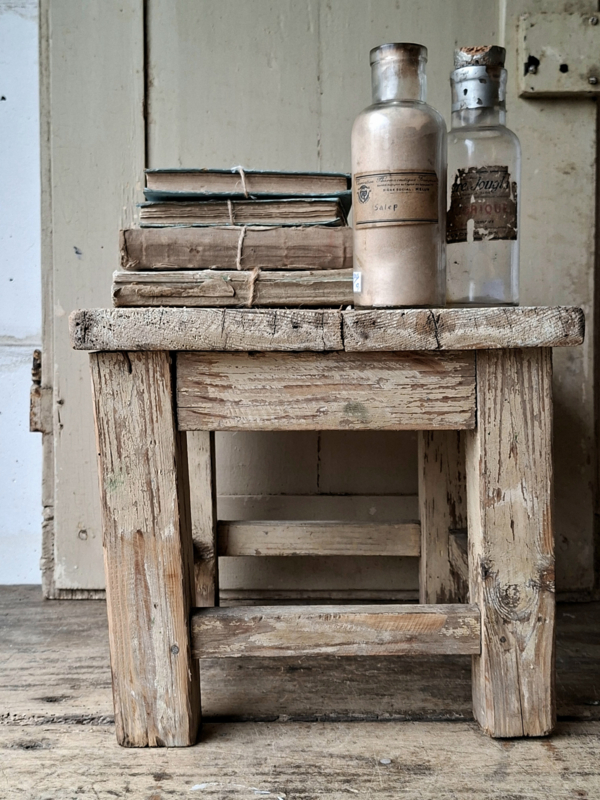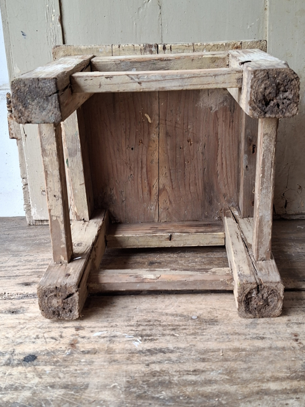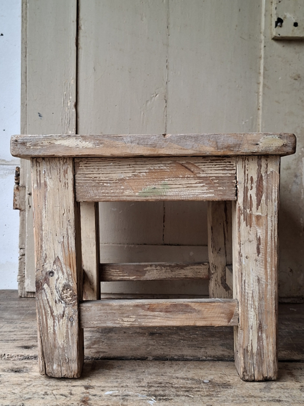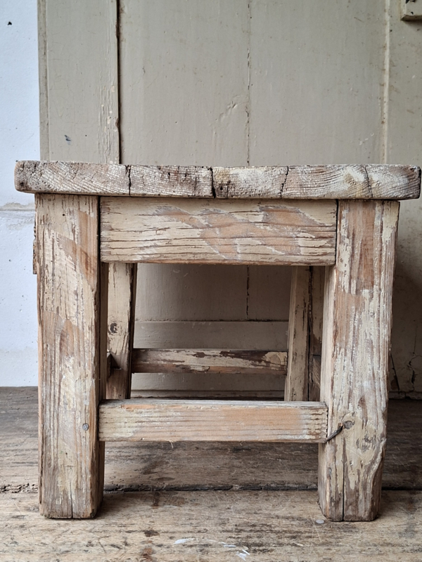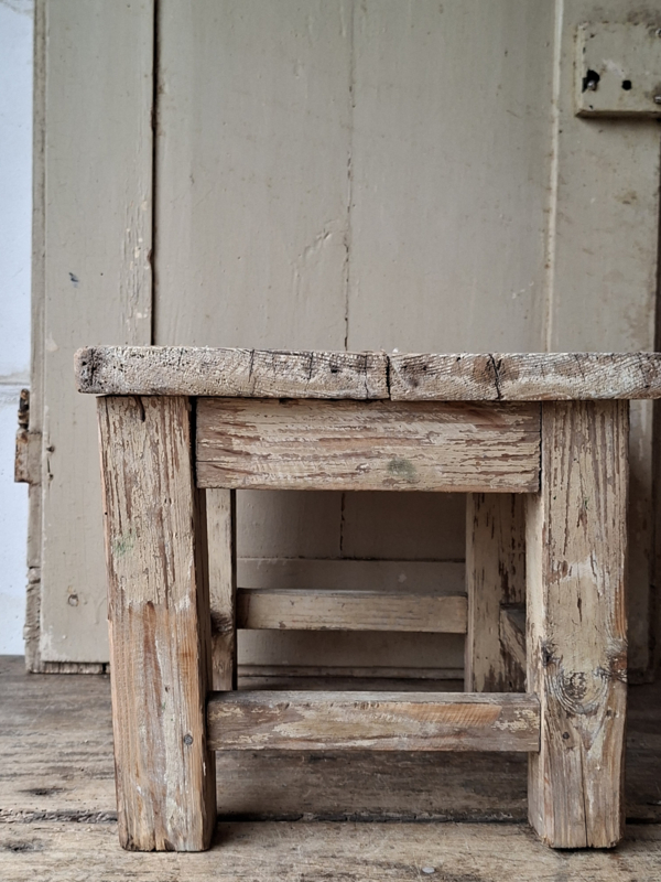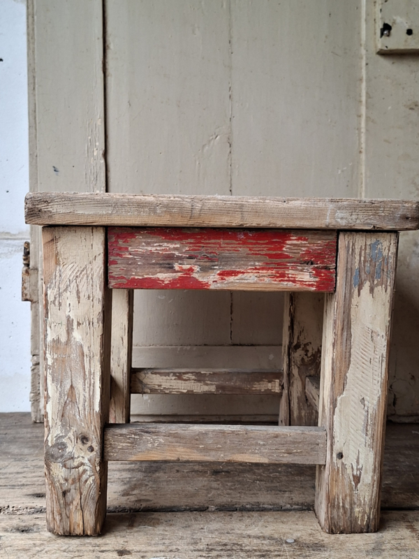 Klein laag oud vierkant krukje. Het is al zo oud, de ouderdom en doorleefdheid is zeker te zien. Het is niet perfect recht, wat scheef. Mooi als decoratie als bijvoorbeeld verhoger op weer andere items op te zetten. Één zijde heeft oude rode verf, dit kun je aan de achterzijde zetten