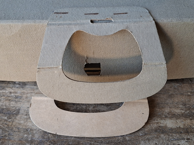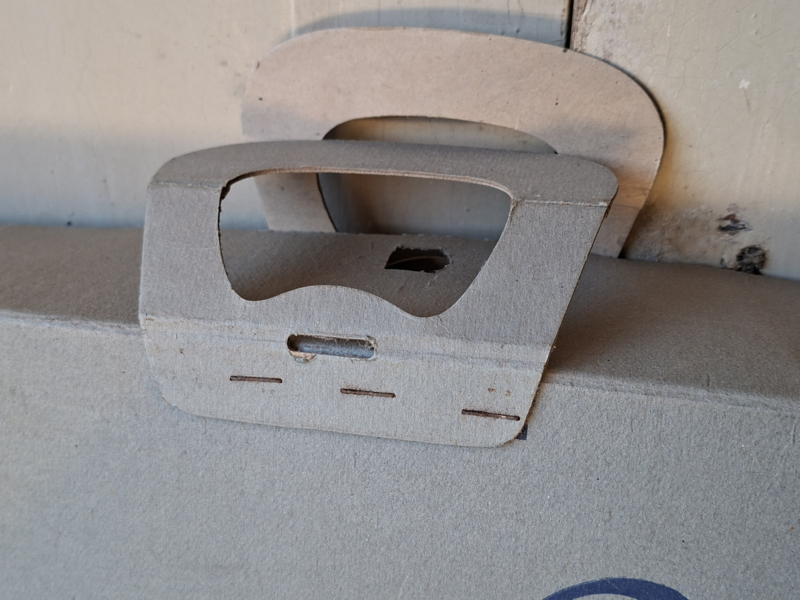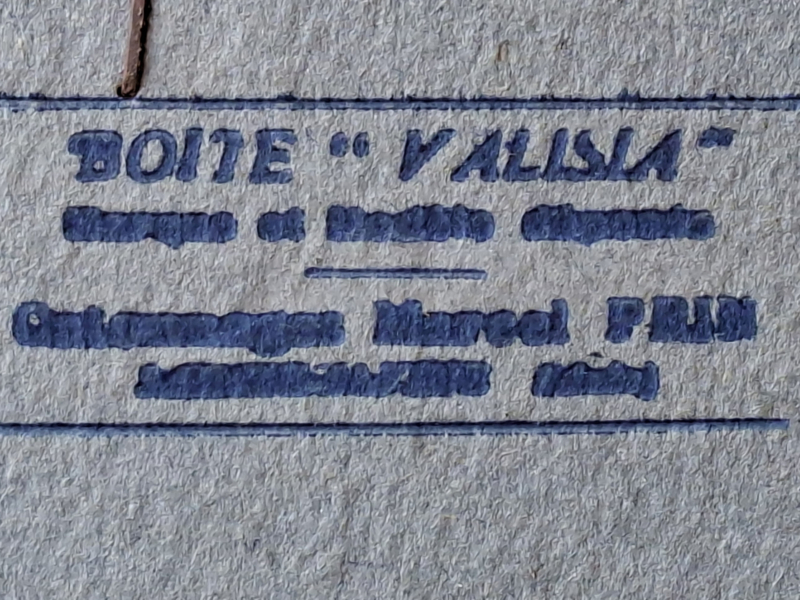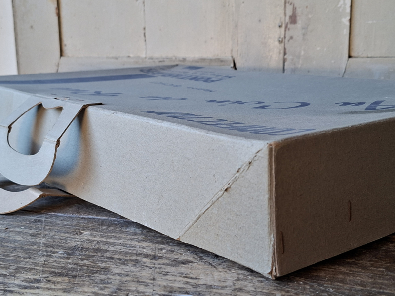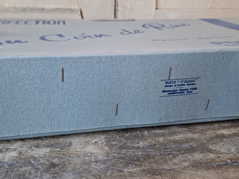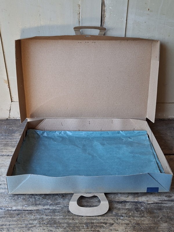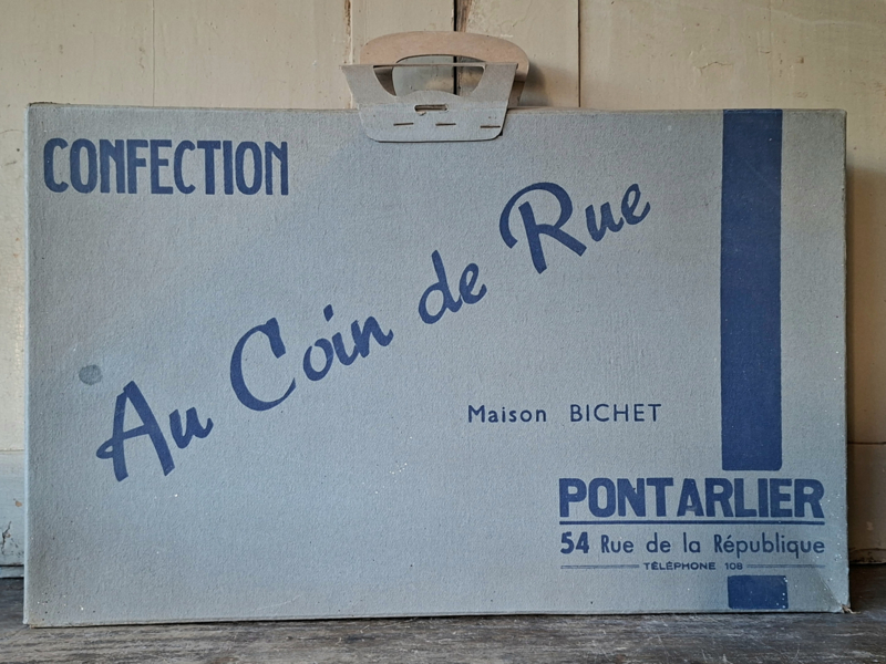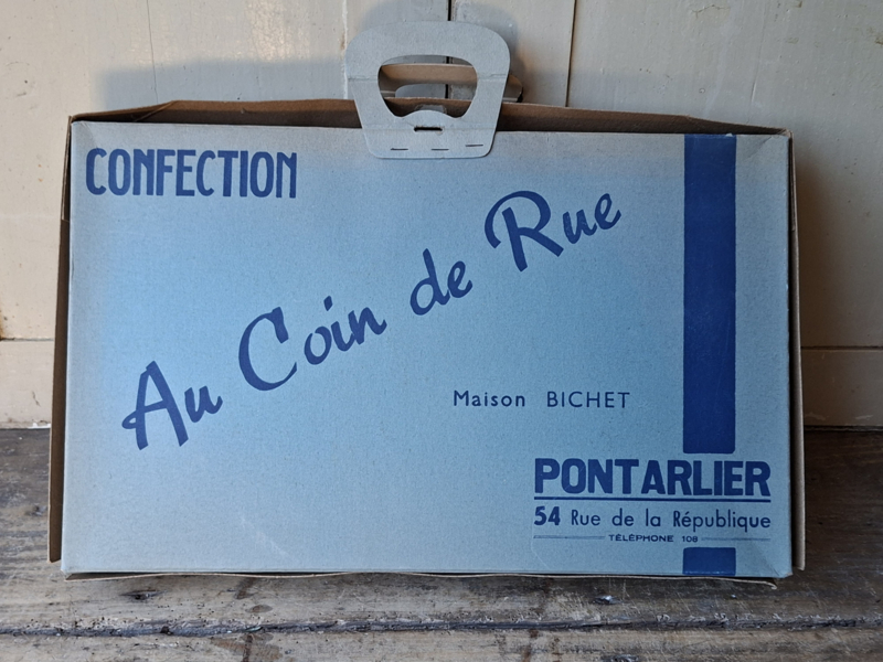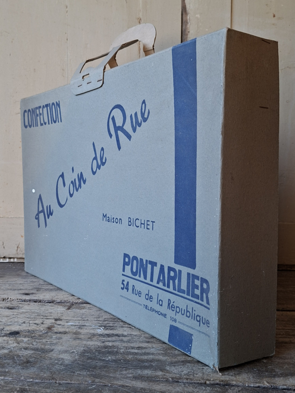 Grote oude franse winkeldoos, confectiedoos. In vroegere tijden werd de confectie bij aankoop netjes verpakt in deze kartonnen doos. Elke kledingwinkel had zijn eigen verpakking. Deze confectiedoos was van Maison Bichet, uit de plaats Pontarlier. Door de jaren heen is de doos verouderd. In de doos is nog het originele vloeipapier waar de kleding tussen werd gelegd. Mist een stukje karton bij de handgrepen. Je komt deze dozen niet veel meer tegen. Onderdelen zijn geniet.