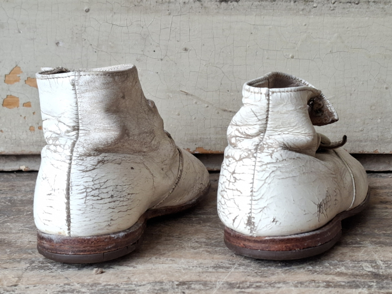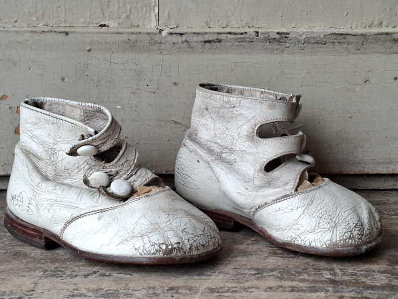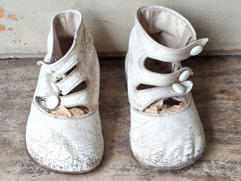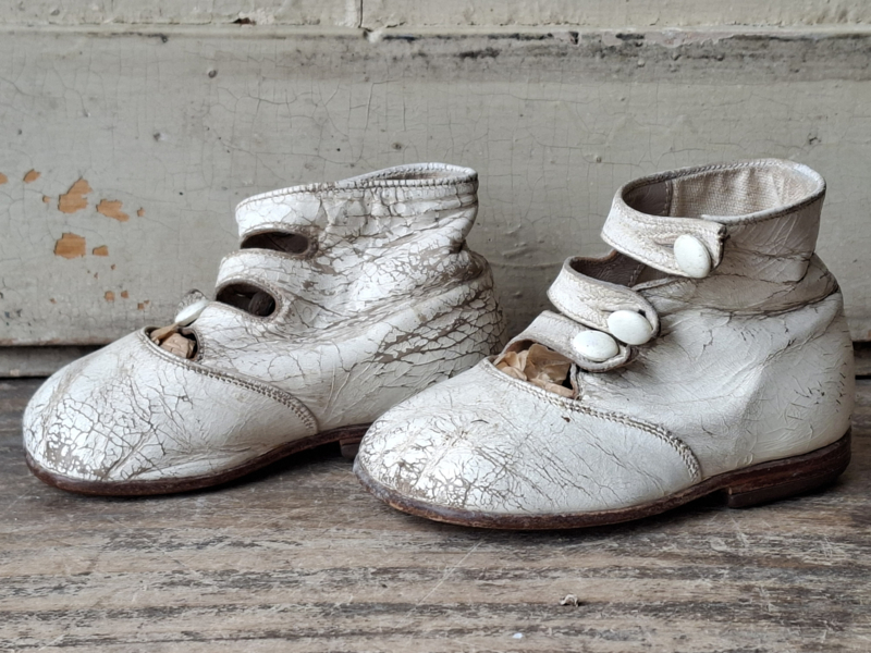 Oude baby meisjes kinderschoentjes, prachtig shabby doorleefd verouderd. Het leer is craquelé verouderd. De schoentjes hebben een knoopjes sluiting. Aan de onderzijde staat maat A18. De schoentjes hebben dezelfde maat, linker en rechter schoentje, ze horen van oorsprong bij elkaar.