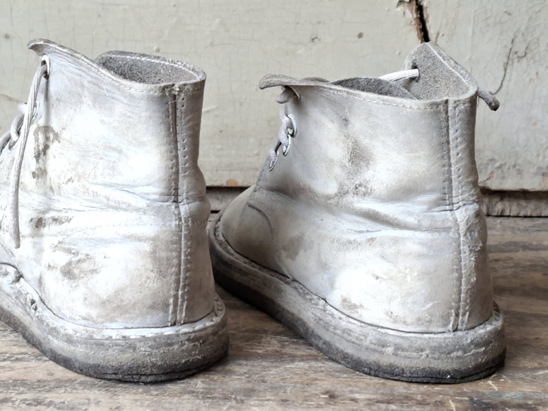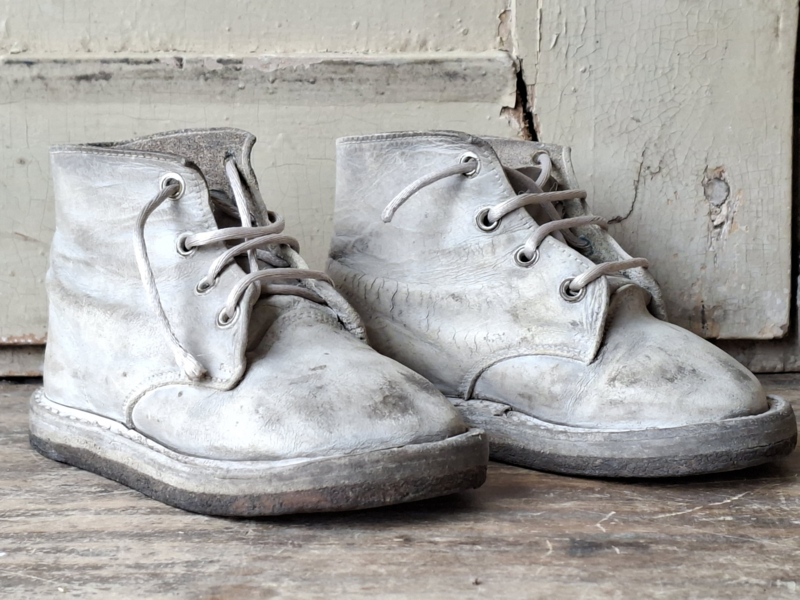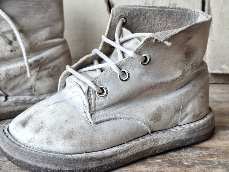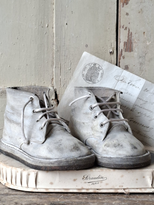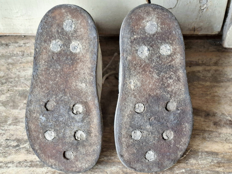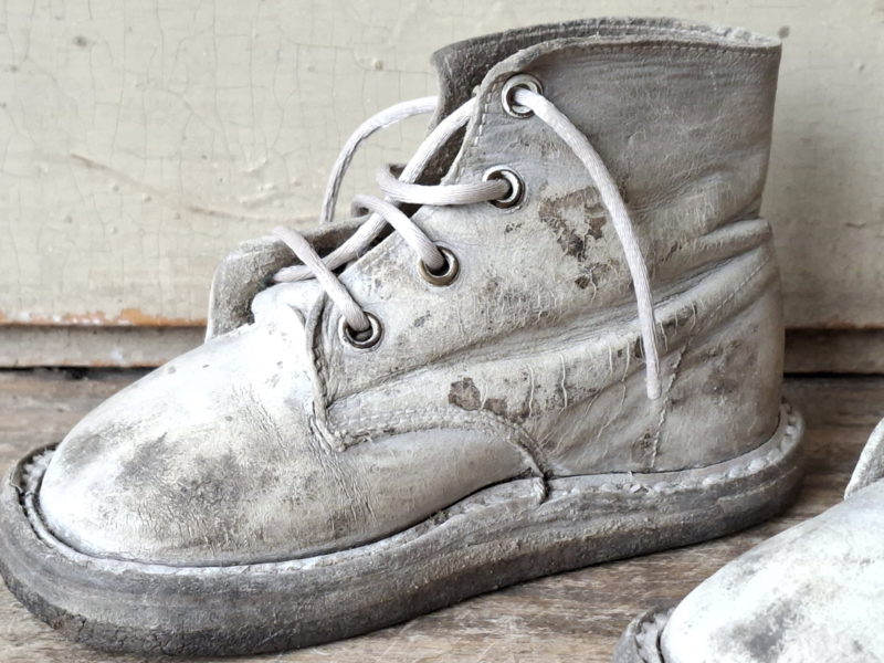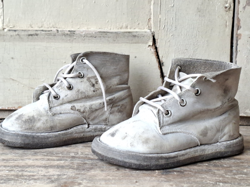 Oude babyschoentjes, shabby verouderd. Het leer is verouderd en kleuringsplekken. Het linker en rechter schoentje horen van oorsprong bij elkaar.