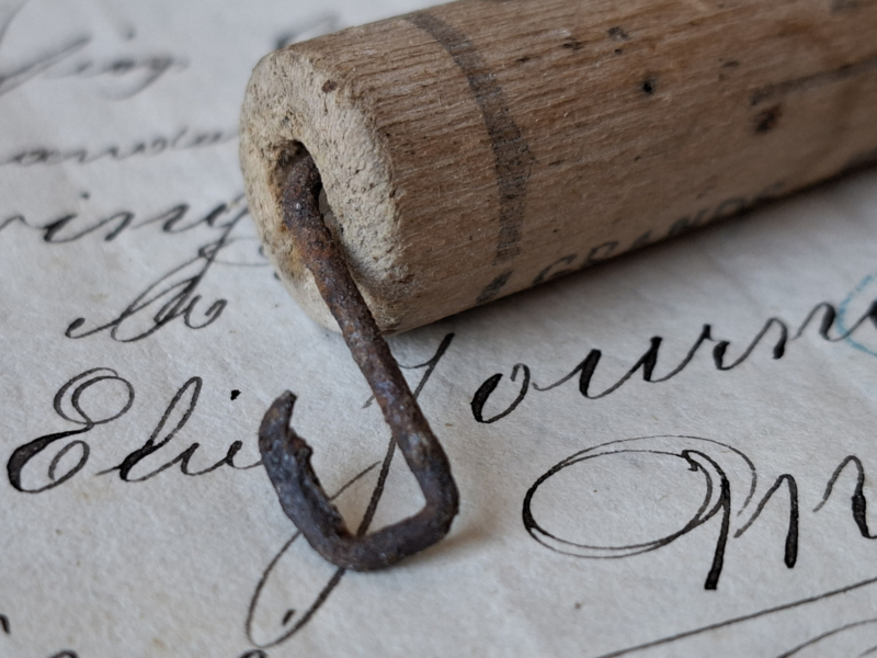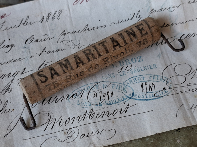Oude franse tassendrager van Magasins Samaritaine, Paris. Vroeger gebruikte men deze als tassendrager, in de winkel gingen de aankopen in een plastic tasje. De lussen werden aan het klosje gehangen en het was daardoor makkelijker te dragen. Het klosje is van hout, het metaal verouderd. Nu prachtig als decoratie.