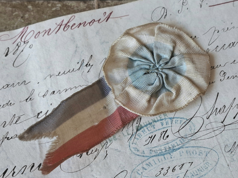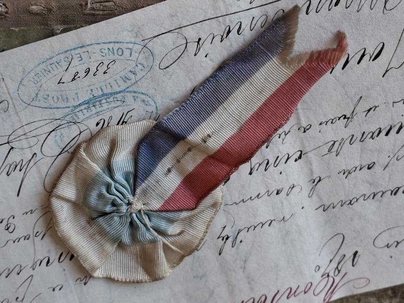 Heel oud franse rozet lint, rozette. Het is al zo oud, dat is zeker zichtbaar. Verouderde kleuren en geleefd. Rozet en lint in de kleuren van de franse vlag.