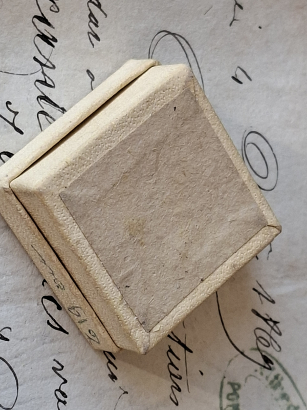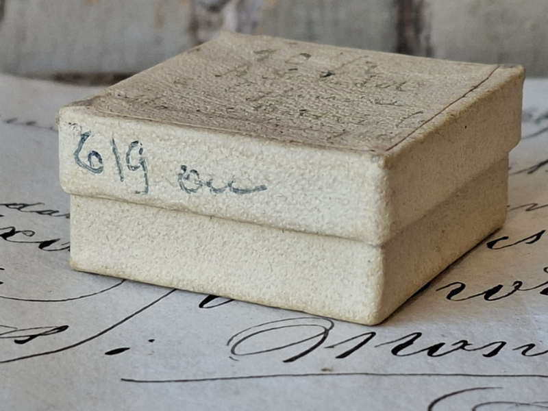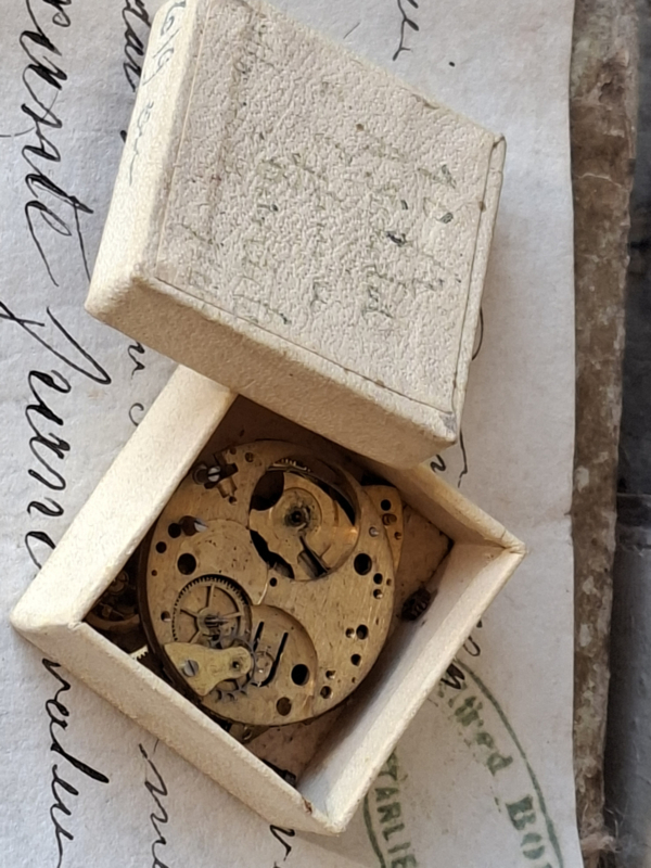 Heel oud frans juweliersdoosje. Op het doosje van karton is een handgeschreven tekst. In het doosje is nog een oud binnen uurwerk van een horloge.
