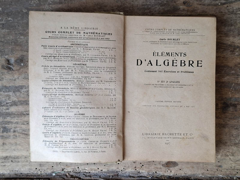 Oud frans school leerboek met harde kaft. Het is geleefd verouderd. Het was voor het vak Algèbre, Algebra. Het boek heeft als jaartal 1917. Oude franse boeken zijn prachtig als decoratie.