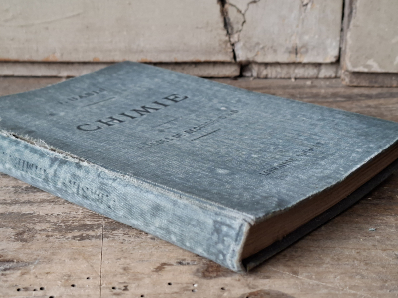 Oud frans school leerboek met harde kaft Chimie, scheikunde. Het boek heeft als jaartal 1913. Het is doorleefd verouderd. Oude franse boeken zijn prachtig als decoratie.