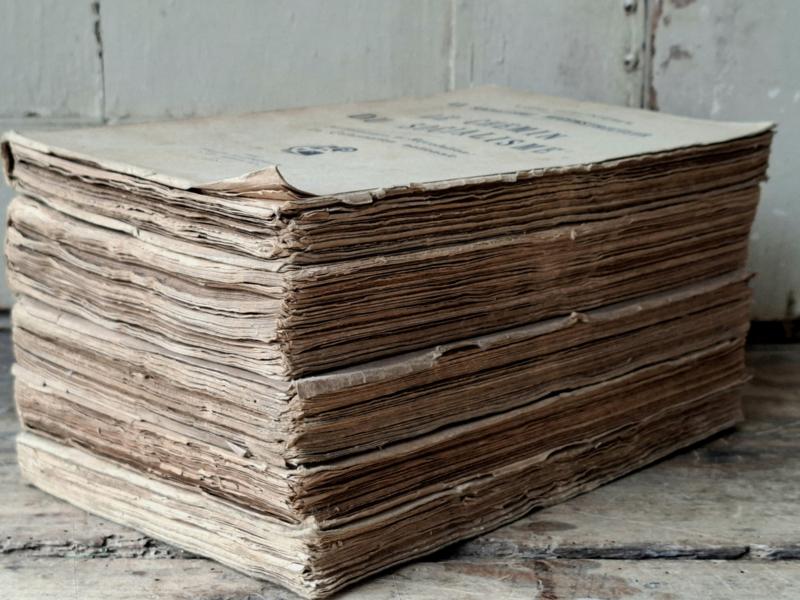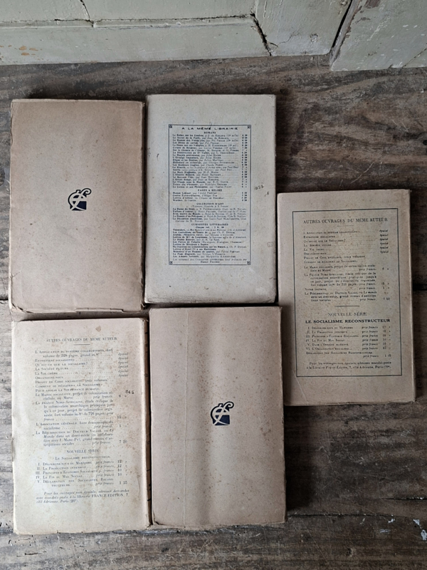 Stapeltje van 5 hele oude boeken. Het papier is prachtig doorleefd verouderd. De boeken zijn nog nooit verkocht, de bladzijden zijn nog niet losgesneden. De boeken zijn wel door te bladeren per aantal bladzijden. Deze oude boeken zijn prachtig als decoratie, leg ze gestapeld neer met mooie items erop. Je kunt ze natuurlijk ook neerzetten. De boeken zijn van 1927 t/m 1931