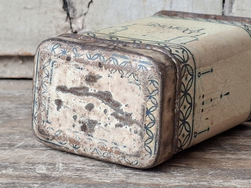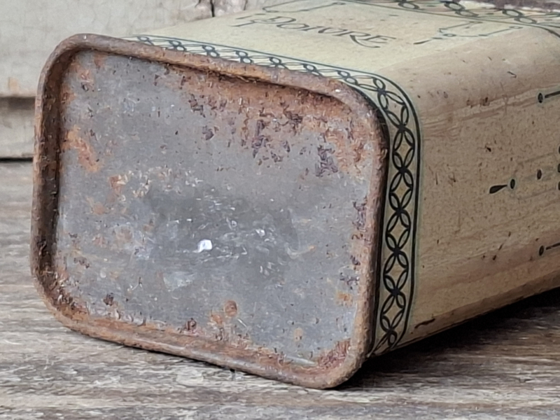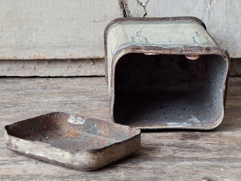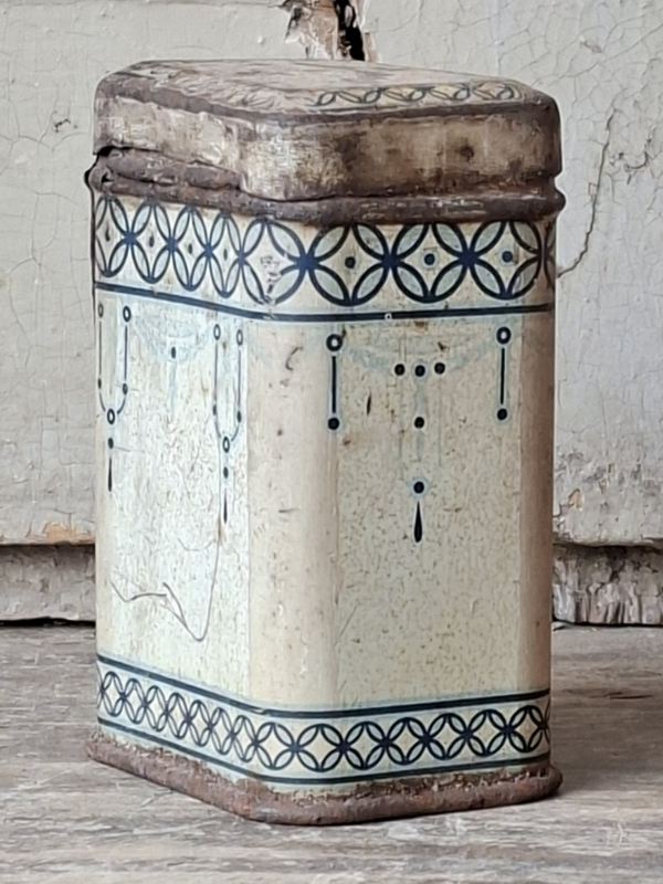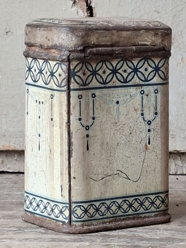 Heel oud shabby frans poivre, peperblikje. Van oorsprong scharniert het dekseltje, door de ouderdom is het nu een los dekseltje.
