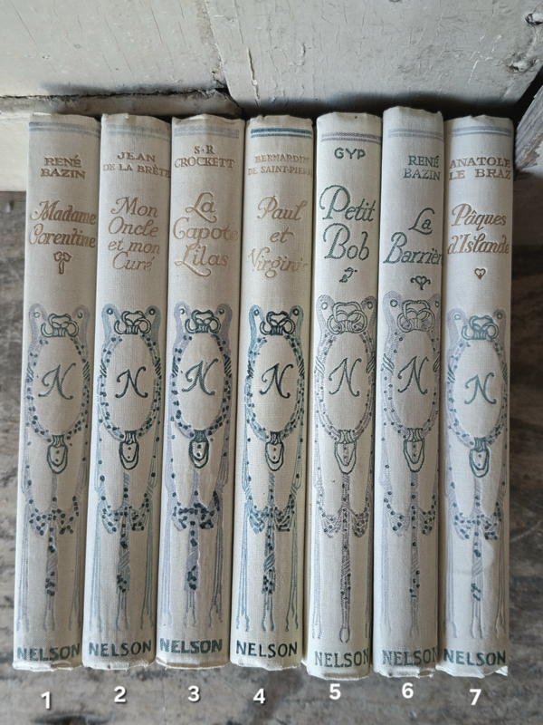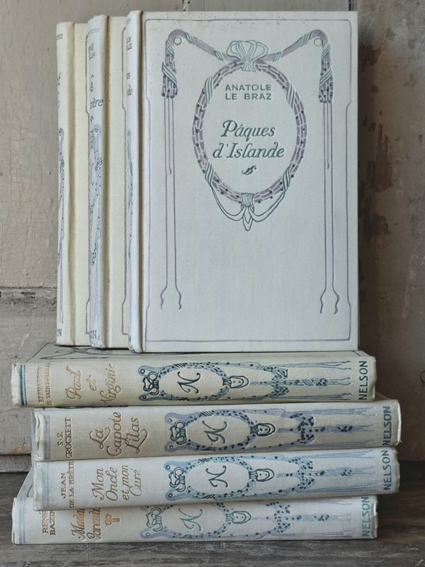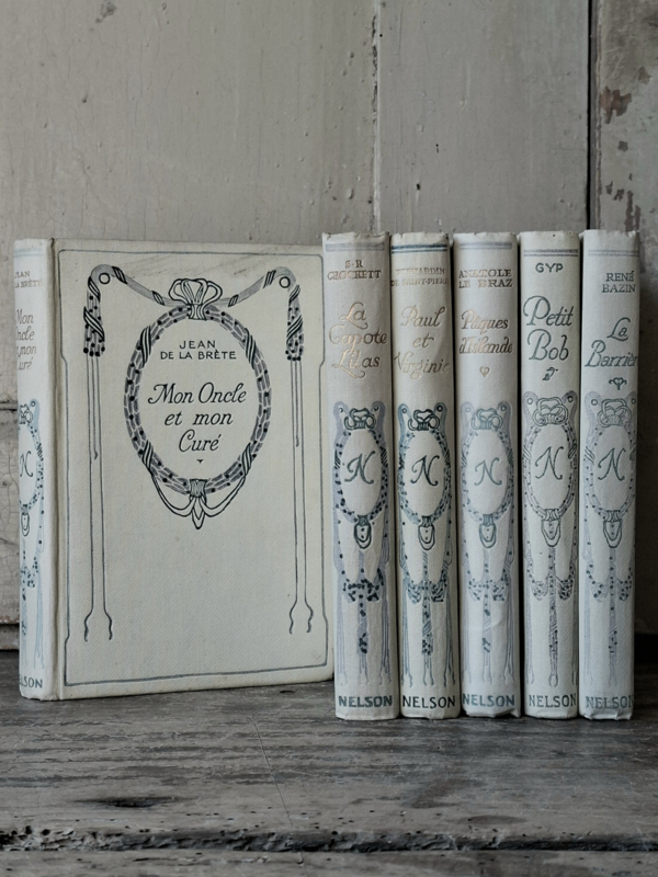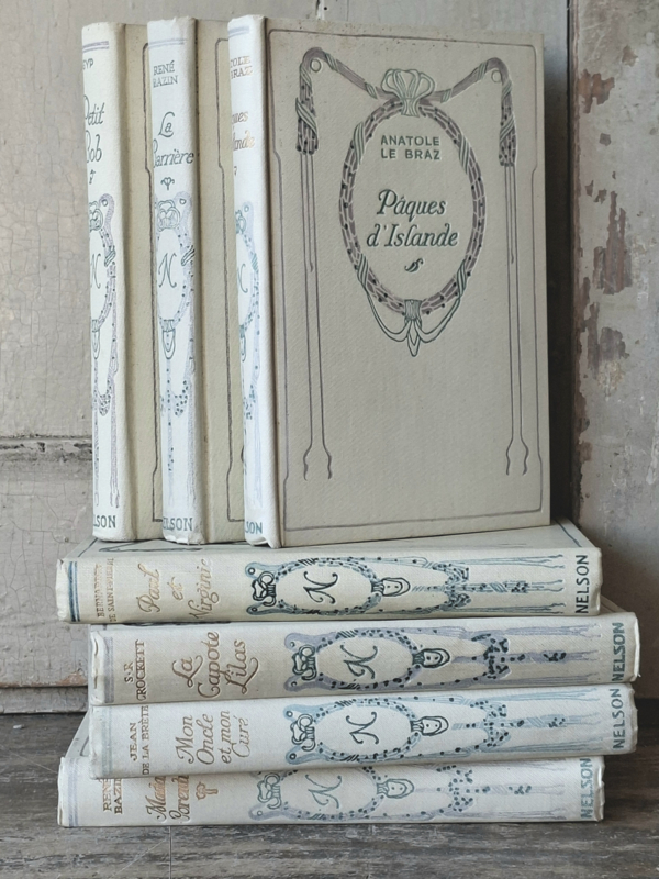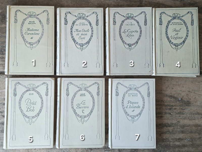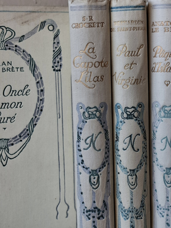 Oude vintage franse boekjes, de kaft heeft een opmaak in Art Nouveau stijl. De typische franse stijl maakt het prachtig als decoratie. De boekjes met harde kaft zijn al op leeftijd en hebben zo hun sporen. Oude franse boekjes zijn prachtig als decoratie.