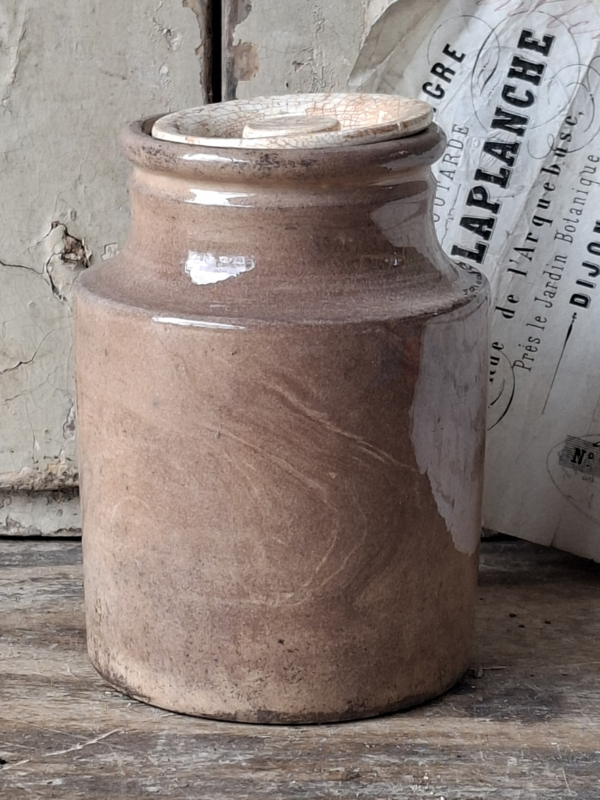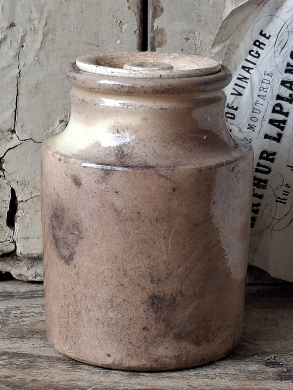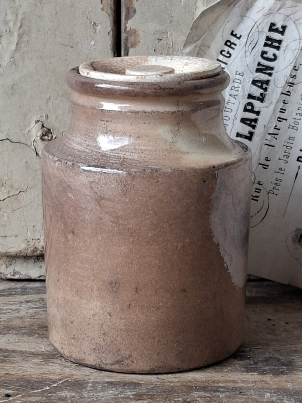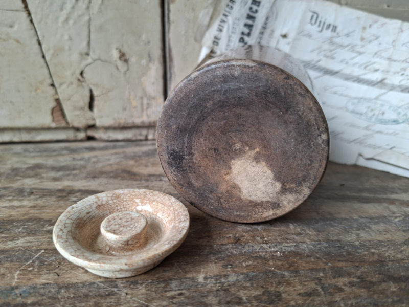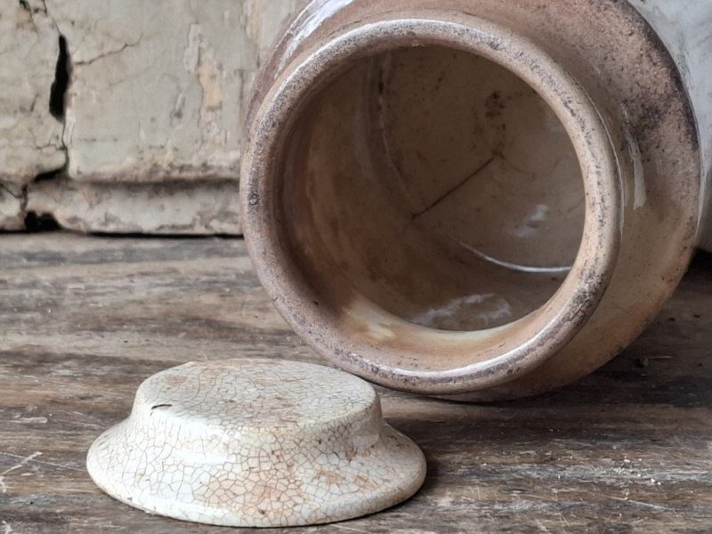 Artikelnummer: 260350Zelden kom je een zalfpotje tegen met deksel! Deze heeft de originele deksel, hoe bijzonder. Het kleine zalfpotje is zwaar beboterd en gezien de ouderdom nog in een mooie staat.