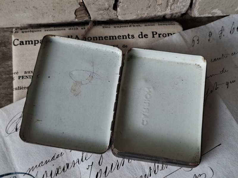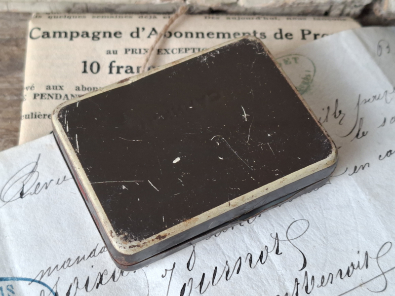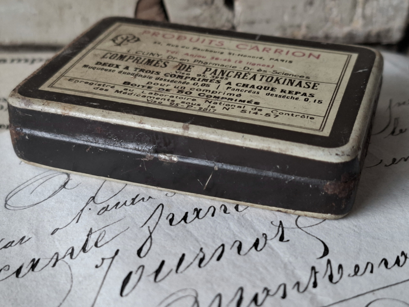 Oud frans pharmacie blikje van Produits Carrion, Paris. In het blikje waren ooit tabletten voor de spijsvertering. Het blikje is geleefd verouderd. Oude pharmacieblikjes zijn prachtig als decoratie.