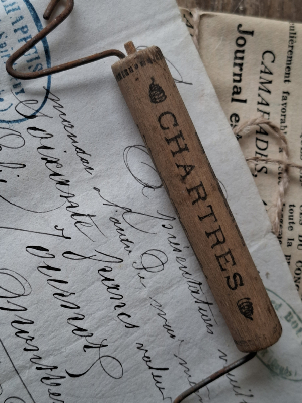 Oude franse tasdrager van de winkel Palais du Ventement, Charters. Deze tasdragers werden gebruikt om een tasje van de winkel aan te hangen, het draagde makkelijk. Op het houten klosje staat reclame voor de winkel. Mooi als decoratie.