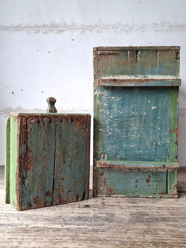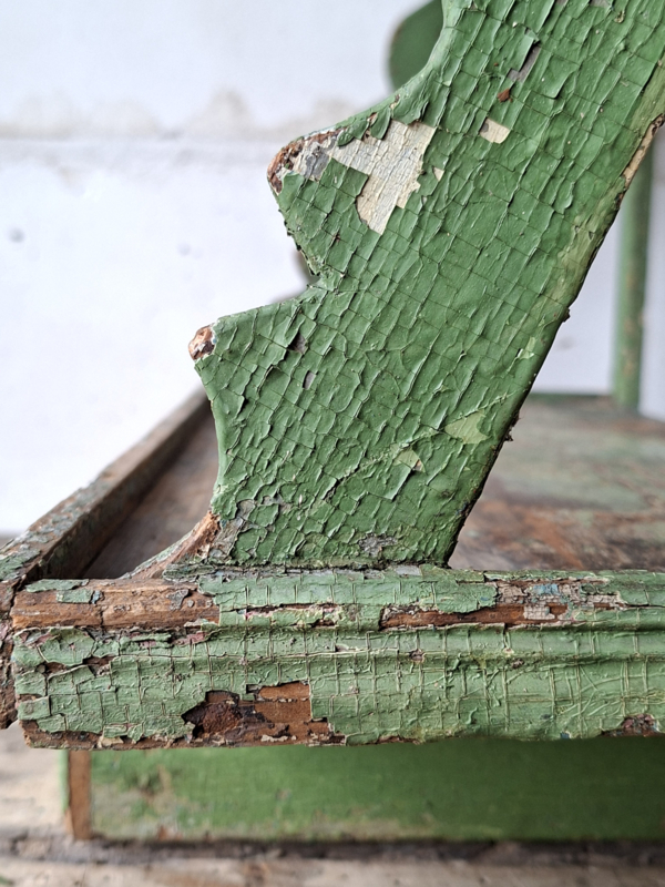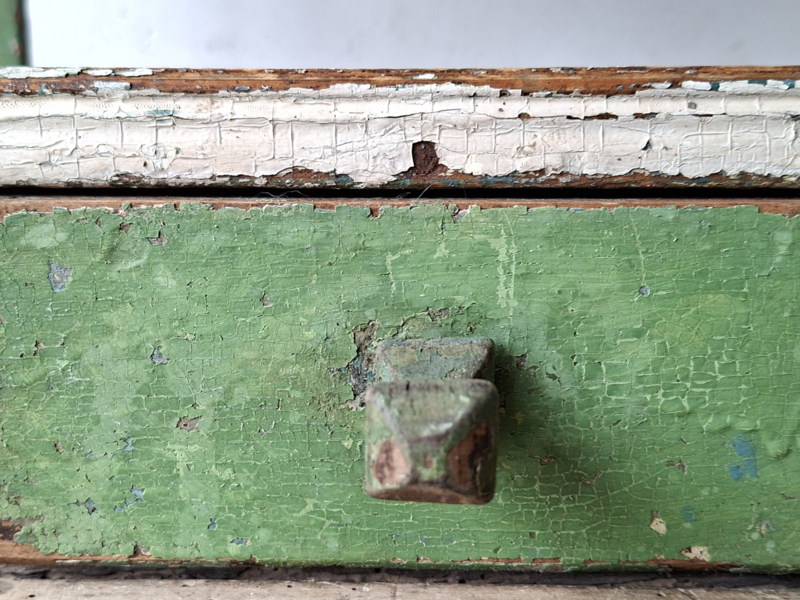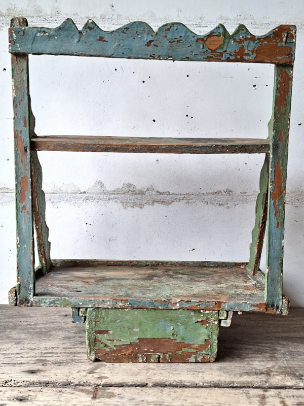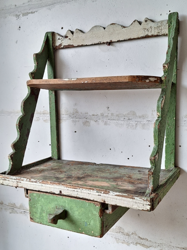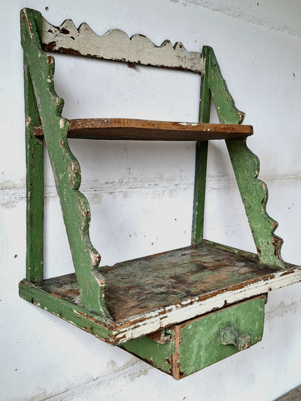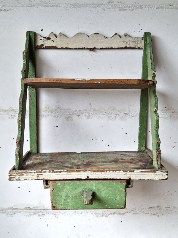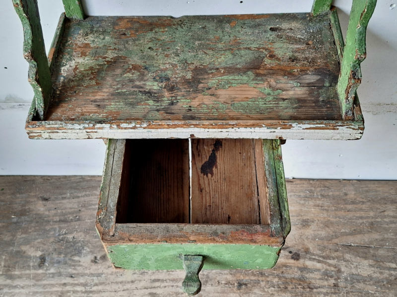 Artikelnummer: 260355Heel oud klein houten wandrekje. Het is in authentieke staat en heeft diverse oude verflagen. De verf is doorleefd met craquelé. Aan de onderzijde is een klein laatje dat open en dicht schuift. Dit rekje kun je alleen ophangen anders schuift het laatje niet. Door het kleinere formaat geef je het makkelijk een plekje.