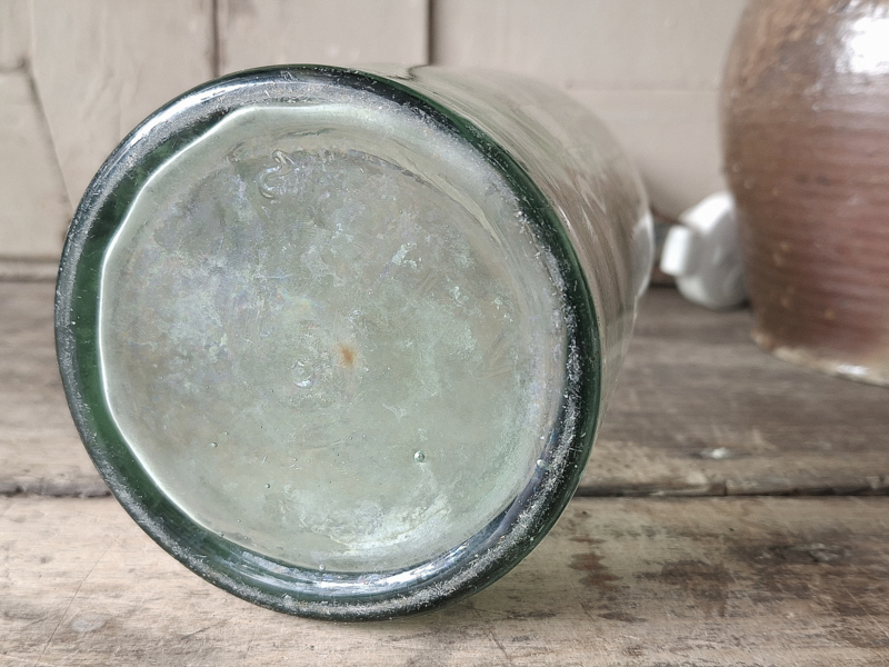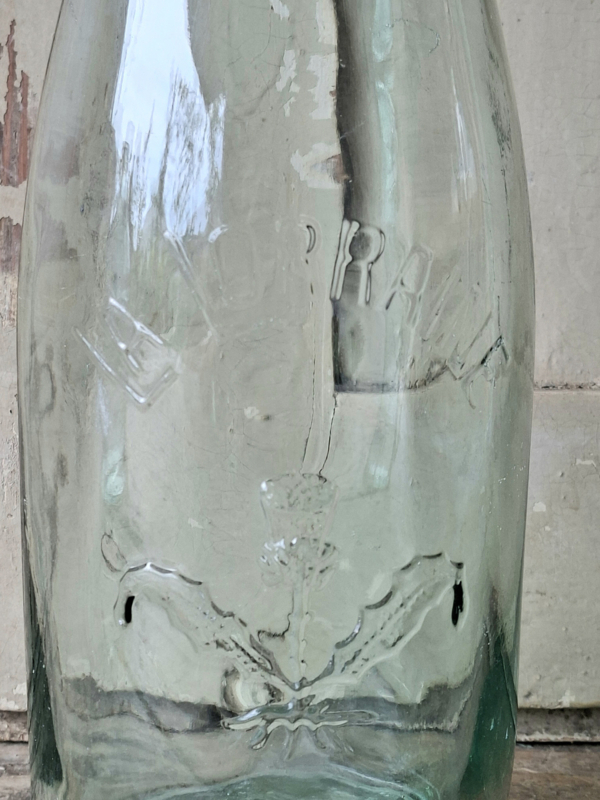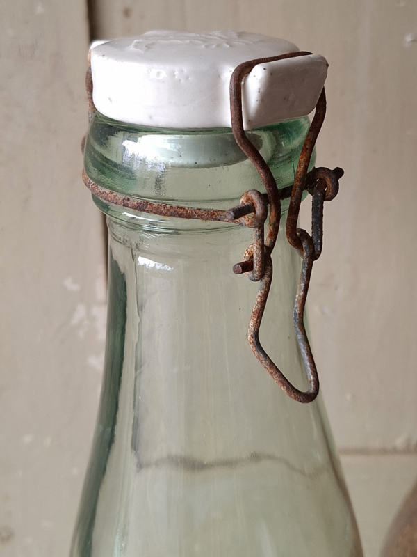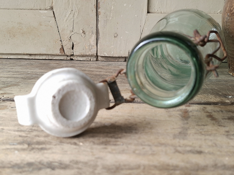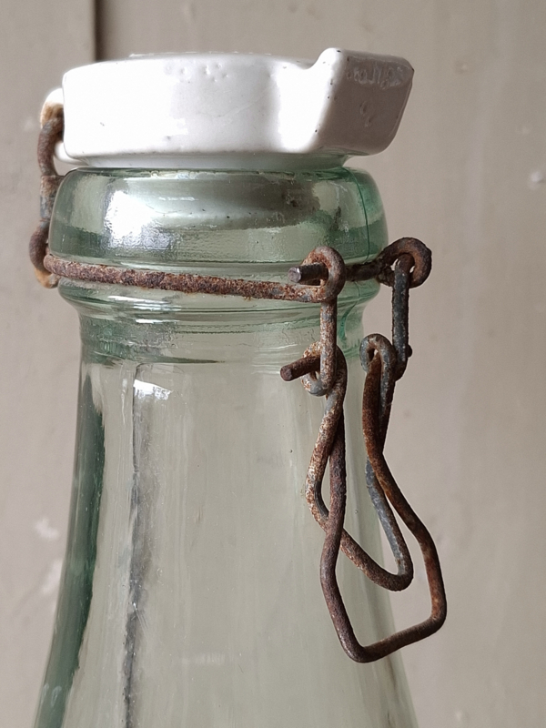 Oude franse weckfles van La Lorraine. In het glas het kenmerkende logo met de tekst la lorraine. Deze weckfles heeft een inhoud van 1 1/2 liter. De sluiting is roestig verouderd, het glas door de ouderdom sporen. De weckfles heeft een porseleinen dop.