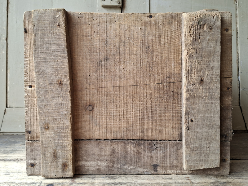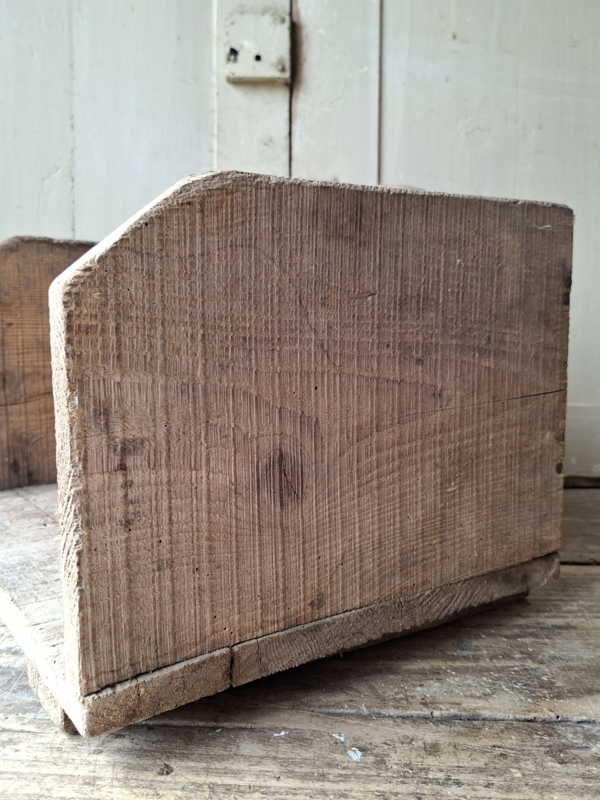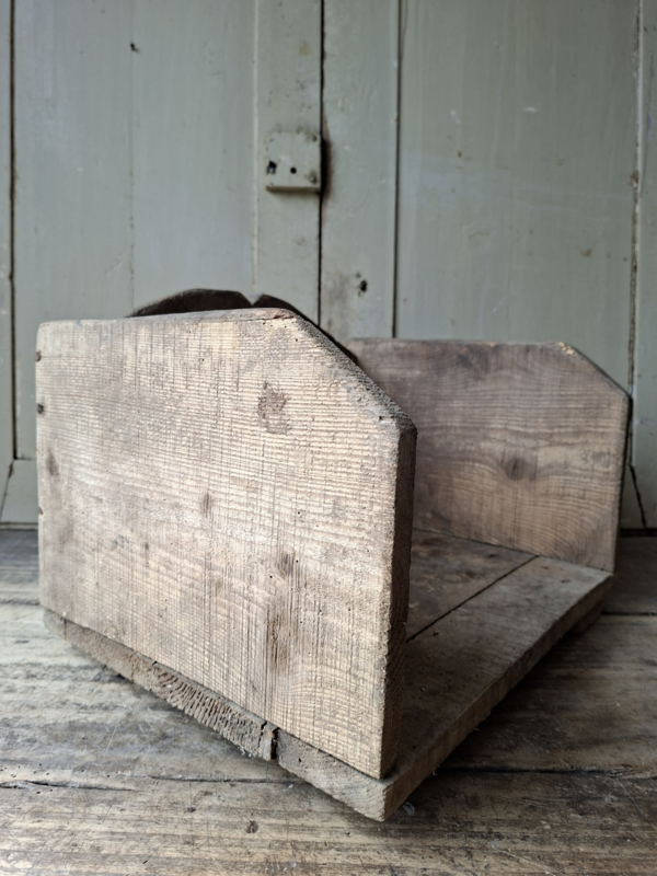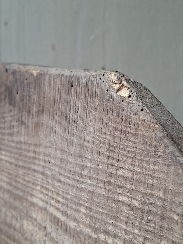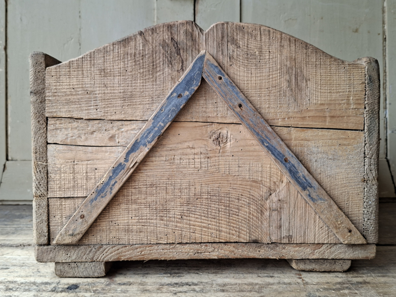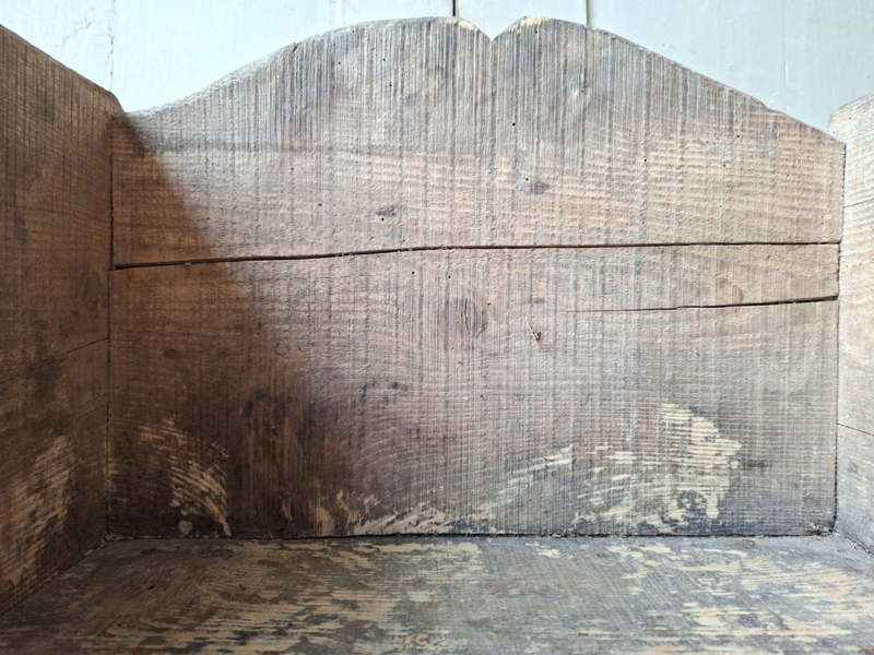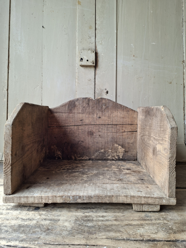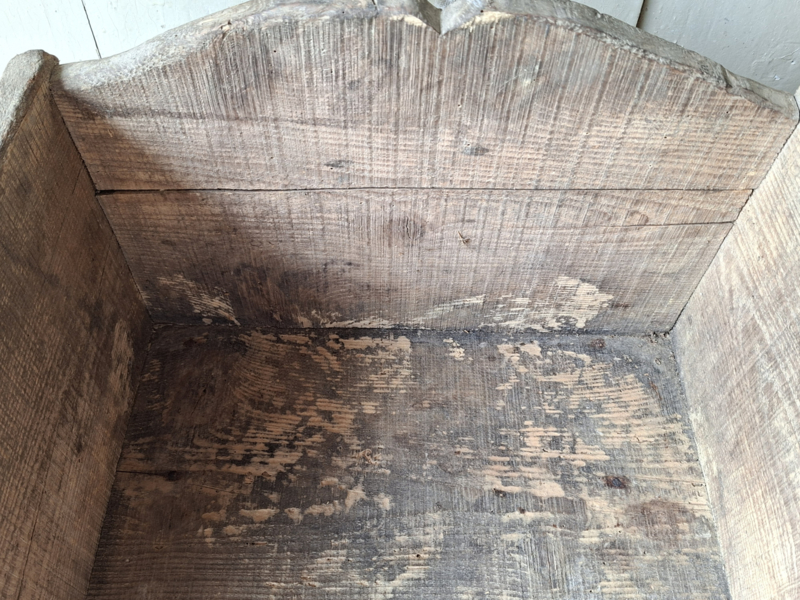 Hele oude knielbak uit Frankrijk. Het is al zo oud, dat is zeker te zien aan het verouderde hout. Het heeft wat oude donkere houtwormgaatjes, voor zover mogelijk preventief behandeld. Geef de houten bak een mooi plaatsje en zet er mooie items in.