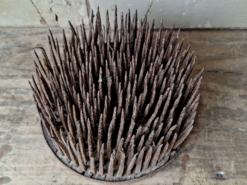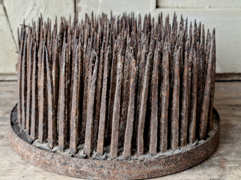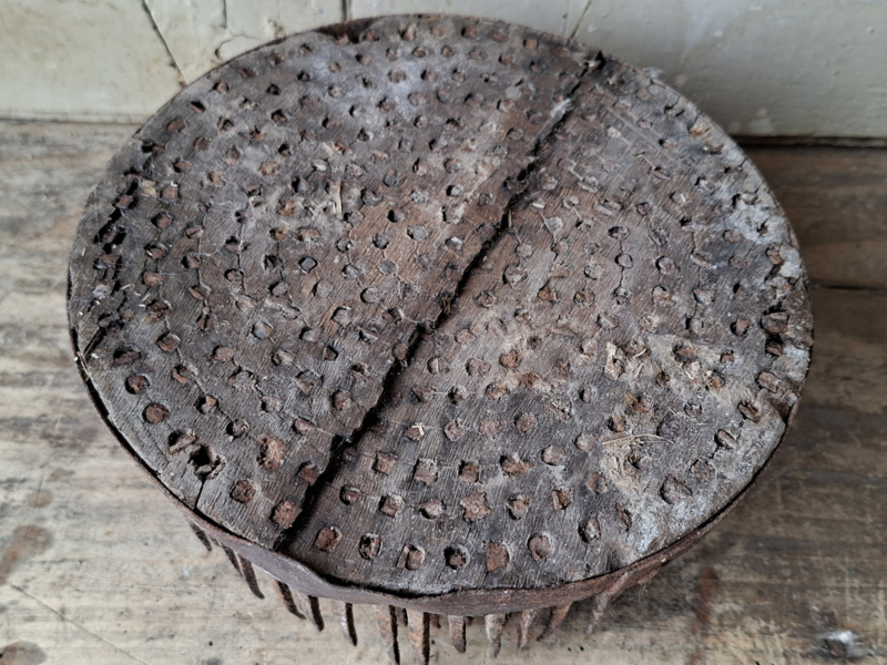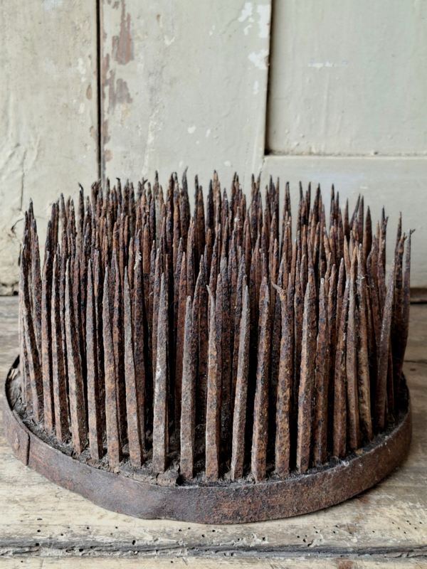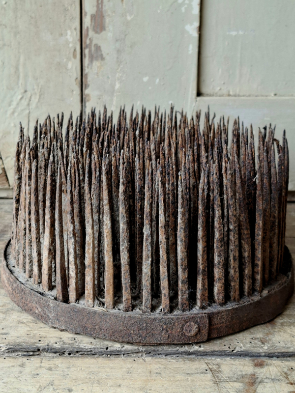 Hele oude grote wolkam van 20cm doorsnede. Geweldig verouderd, de handgemaakte spijkers zijn ooit in het hout geslagen. Nu roestig en doorleefd verouderd. Mooi als decoratie. Deze wolkam is gebruikt en heeft tussen de spijkers op het hout nog oude aanslag.