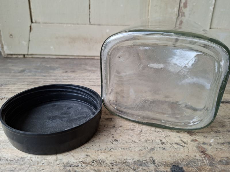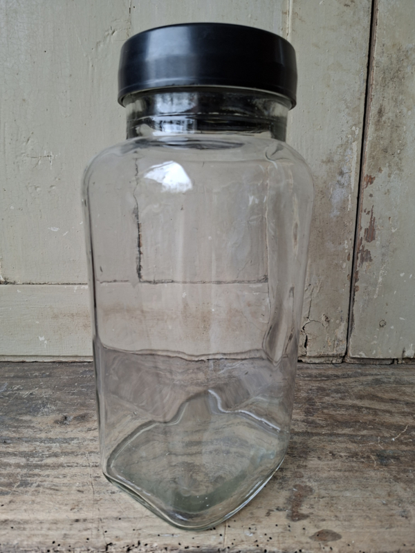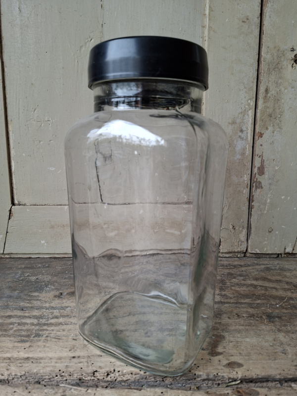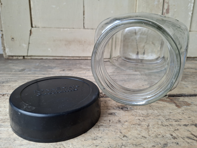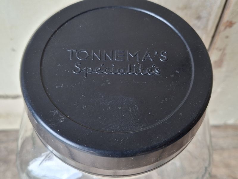 Oude voorraadpot van Tonnema Spécialités. Handgegoten glas en bakeliet deksel met de naam van Tonnema.