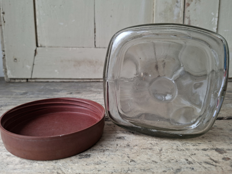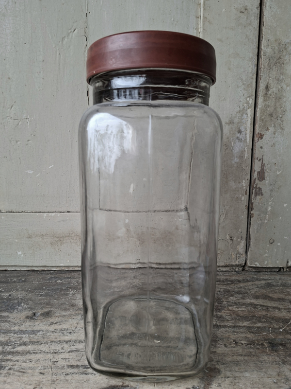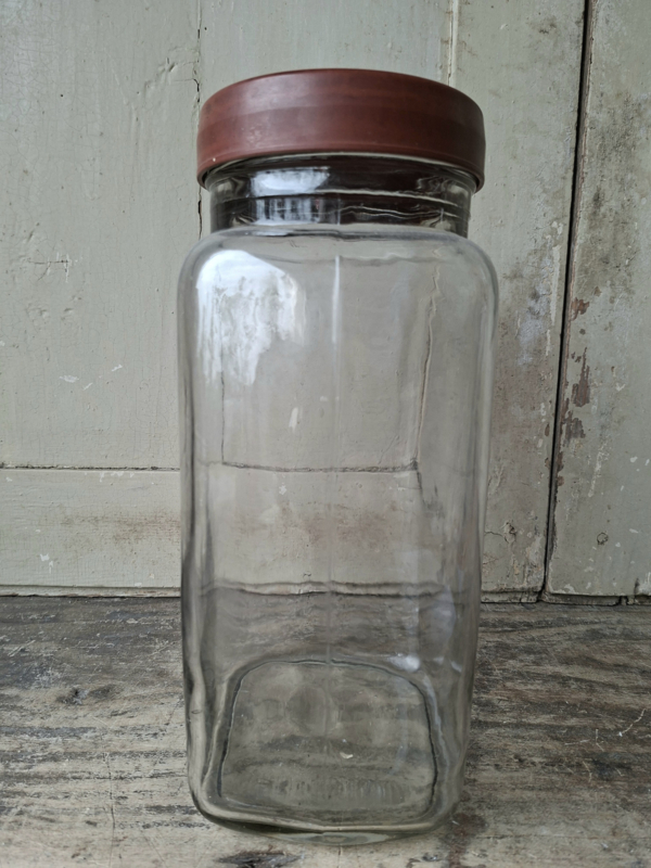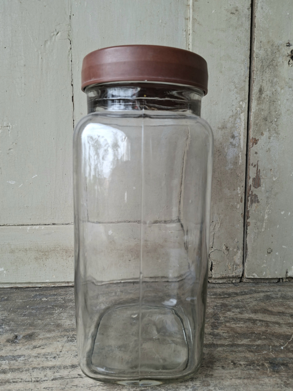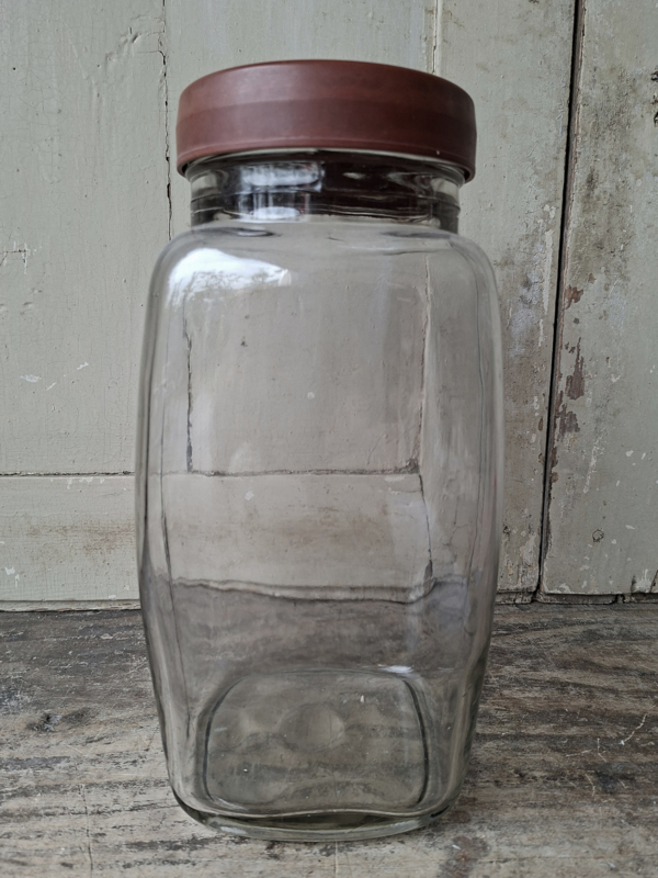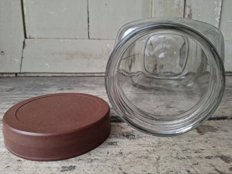 Oude grote vintage glazen voorraadpot. Handgegoten glas en kunststof deksel.