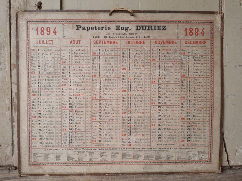 Deze hele oude franse kalender uit 1894 is prachtig verouderd. De kalender van karton heeft door de ouderdom zeker sporen. Aan de voorzijde de eerste helft van het jaar, de achterzijde heeft de tweede helft van het jaar. Aan de onderzijde zijn de lokaties van Banque De France vermeld.