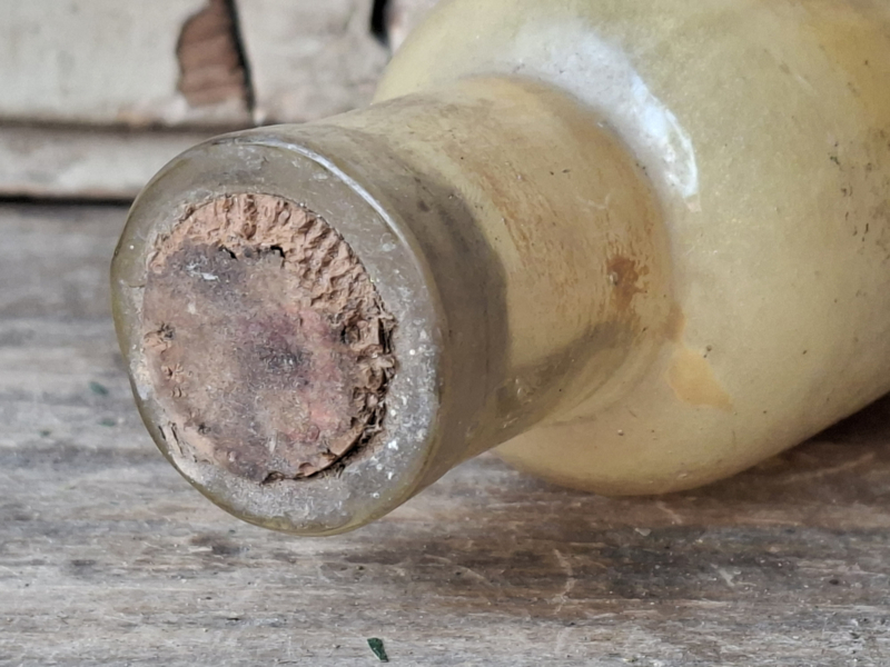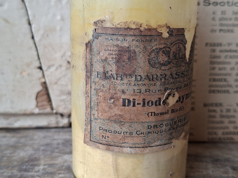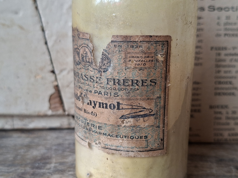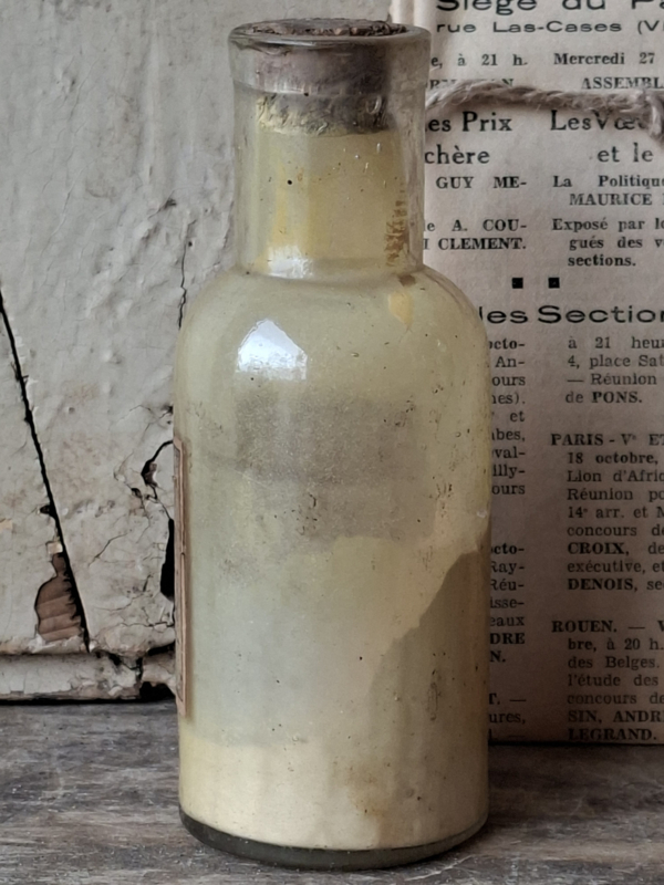 Heel oud inmiddels antiek frans apothekersflesje, pharmacie flesje. Het is verouderd, het heeft het originele etiket. Het flesje heeft nog inhoud, de inhoud is onbekend en niet voor gebruik.