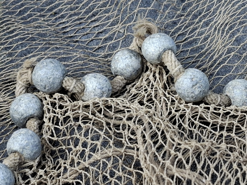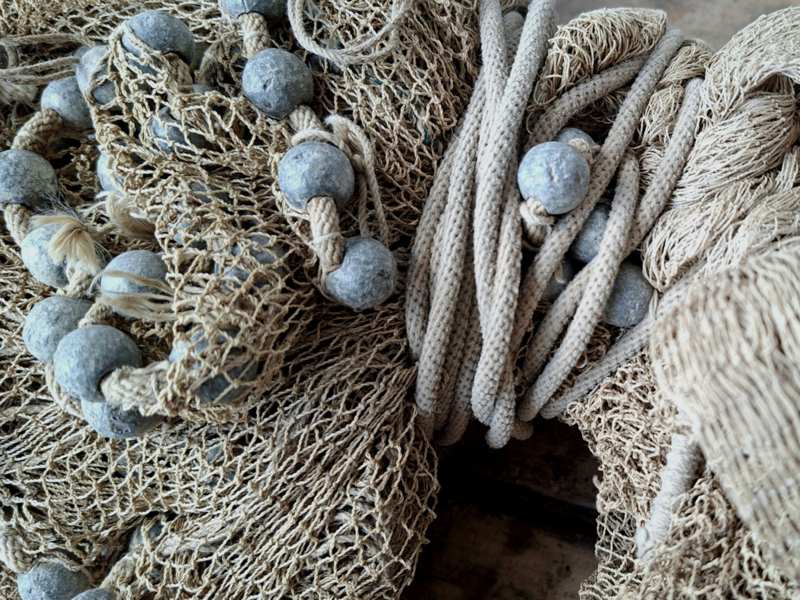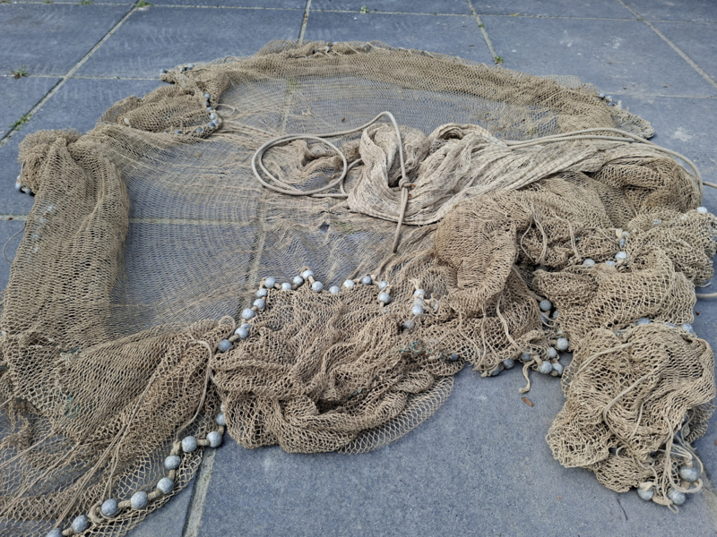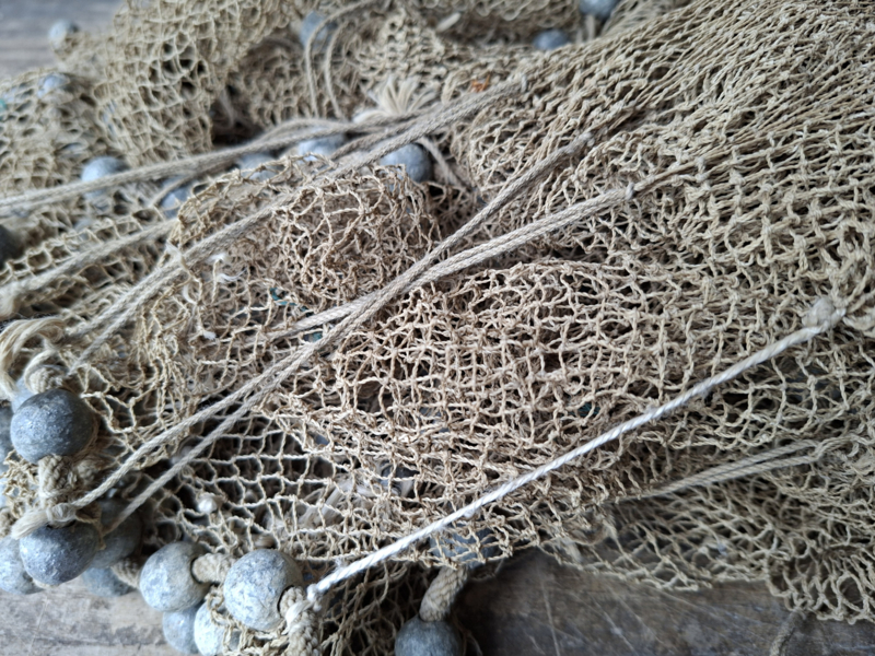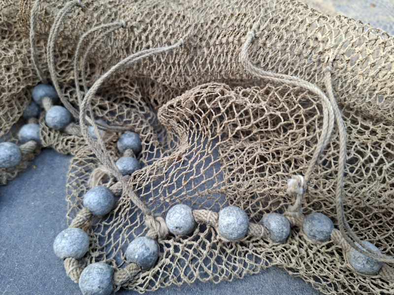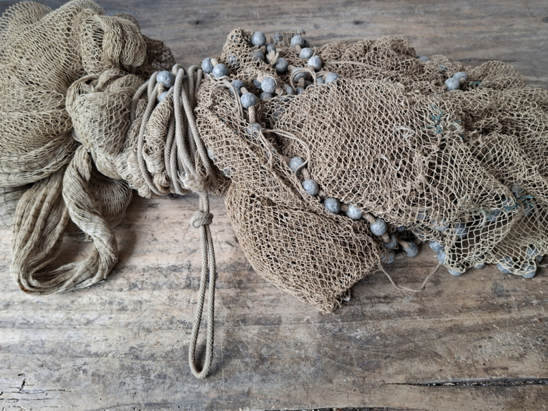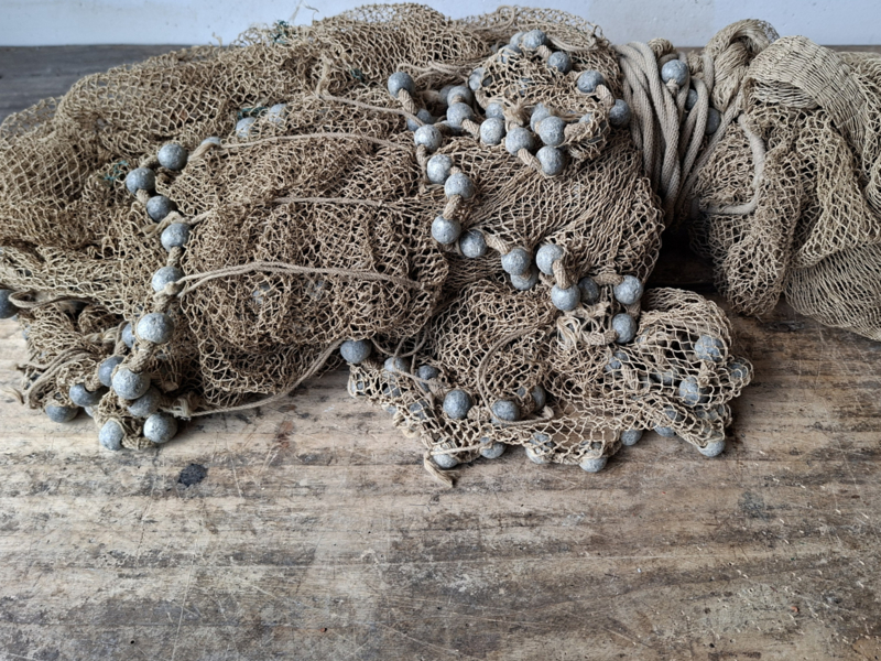 Heel oud inmiddels antiek vissers werpnet uit Frankrijk. Het is een prachtig verouderd werpnet, door de ouderdom een enkel gaatje. Gezien de leeftijd zeker in een mooie staat. Het net heeft rondom veel loden bolletjes, prachtig verweerd verouderd. Het is in authentieke staat, zelfs het touw om het vast te houden. We hebben het niet opgemeten. Om je een indruk te geven, op de laatste afbeelding ligt het op tegels, de tegels zijn 50x50cm. Dit werpnet is geweldig als decoratie.