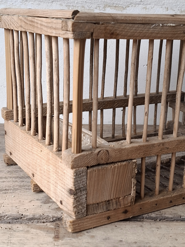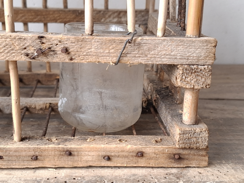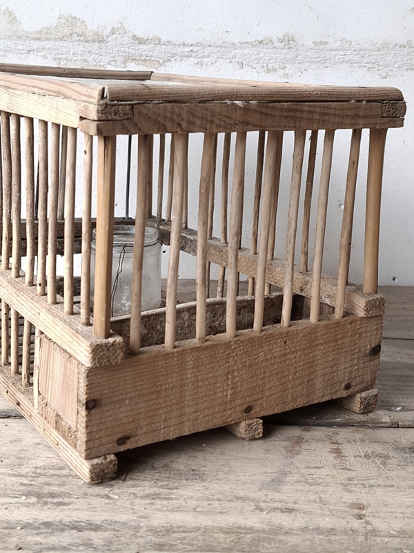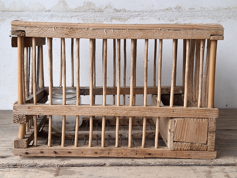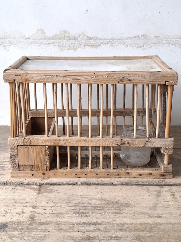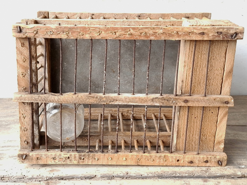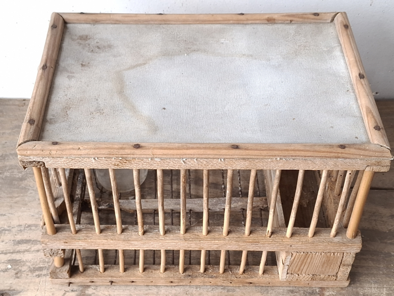 Oud vogelkooitje uit de Provence, Zuid Frankrijk. Deze oude kooitjes zijn typisch voor zuid Frankrijk, ze hebben een dakje van stof. In het kooitje een waterbakje van glas. Het kooitje heeft zo door de ouderdom zijn sporen. Het deurtje opent en sluit. Oude vogelkooitjes zijn prachtig als decoratie. Het heeft nog wat oude aanslag.