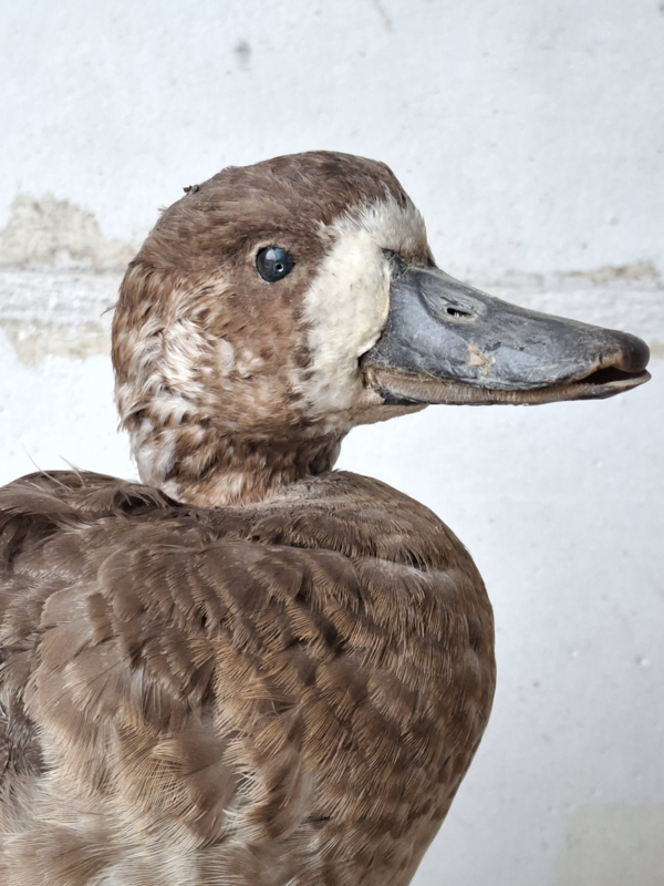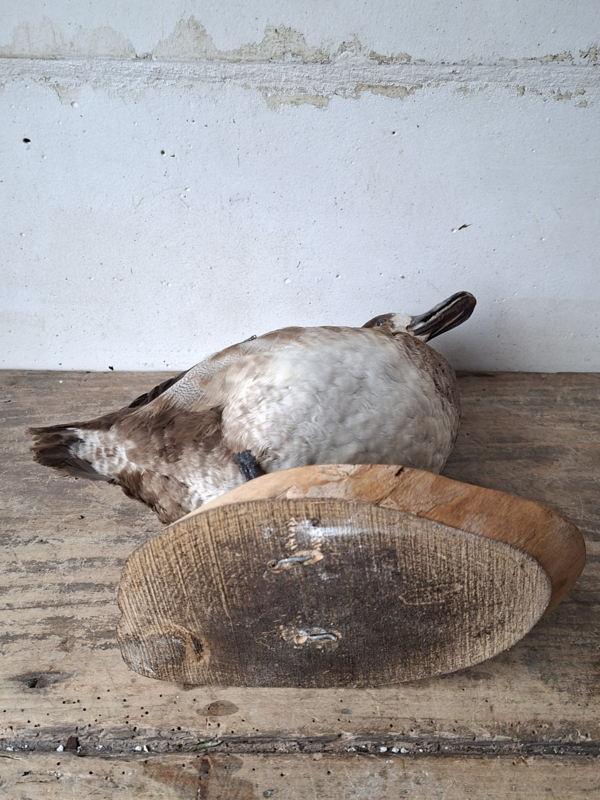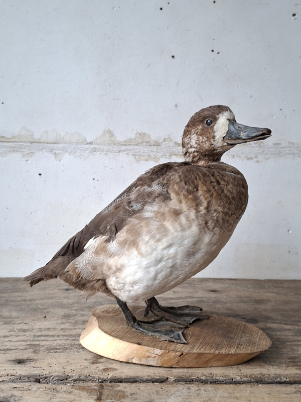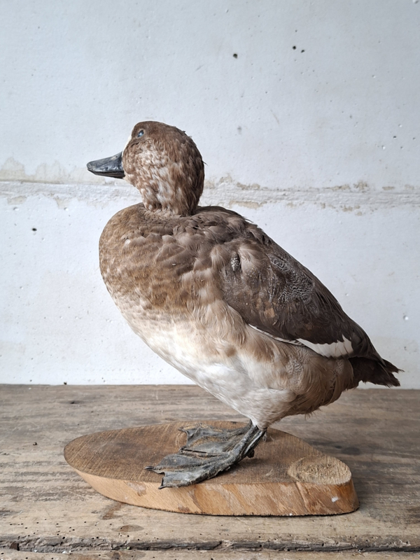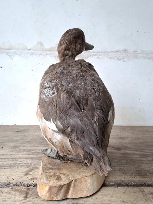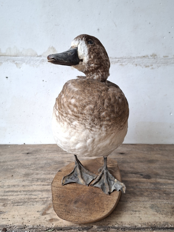 Oude opgezette eend uit Frankrijk. De eend is mooi met aandacht voor details opgezet. De eend staat op een houten boomschijf.