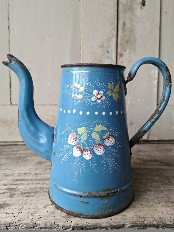 Emaille Kan AardbeiDit hele oude franse emaille kannetje is zo verouderd. Het emaille is aangedaan met oud roestige delen. Het decor van aardbeien is nog goed te zien, ondanks de staat toch een bijzonder kannetje.