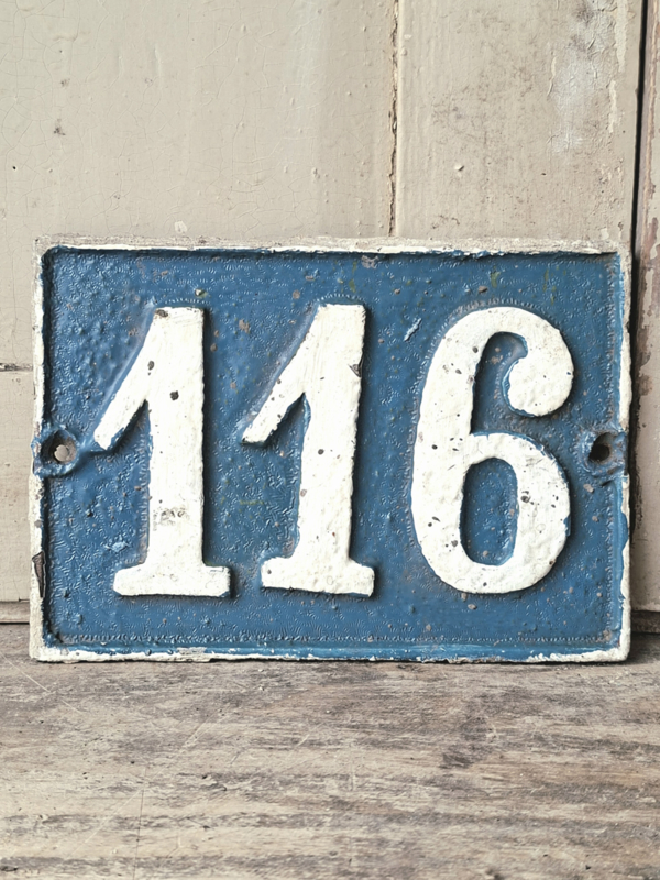 Huisnummer GietijzerHeel oud huisnummer 116, van gietijzer met verf geschilderd. Mooi opliggende cijfers. Het is van zwaar gietijzer gemaakt, in de hoeken zijn openingen om het te bevestigen.