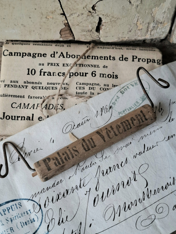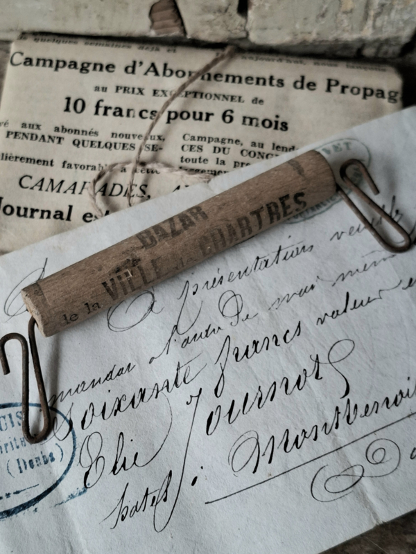 TasdragerOude franse tasdrager van de winkel Palais du Ventement, Charters. Deze tasdragers werden gebruikt om een tasje van de winkel aan te hangen, het draagde makkelijk. Op het houten klosje staat reclame voor de winkel. Mooi als…