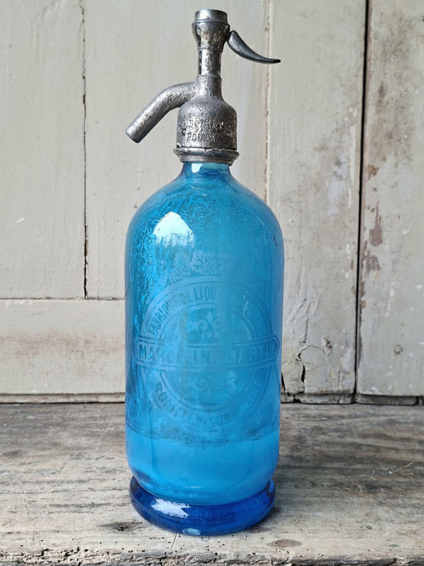 Spuitfles MarcelinOude franse spuitfles blauw glas. Deze spuitfles was van het etablissement Marcelin- Matin - Romily sur Seine. De spuitfles is zeker niet perfect, we de prijs erop aangepast. Twee butsen in het glas, veel oude aanslag aan de…