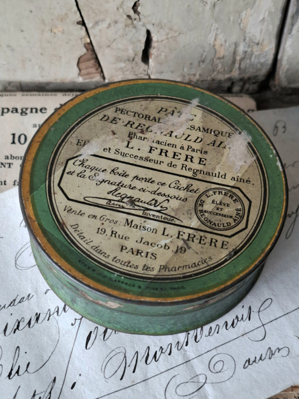 Pharmacie BlikjeHeel oud frans pharmacie blikje van pharmacien a Paris, L.Frere. Het blikje is geleefd verouderd. In het blikje zaten ooit tabletten tegen hoest.