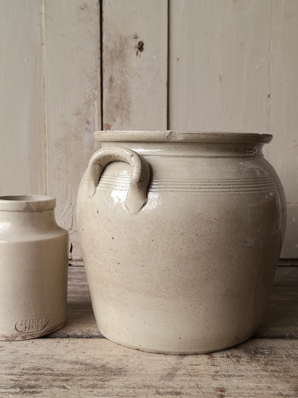 Grote MosterdpotOude inmiddels antieke franse grote mosterdpot. Deze oude pitten zijn handgevormd en geeft het karakter, beigegrijzig van kleur.