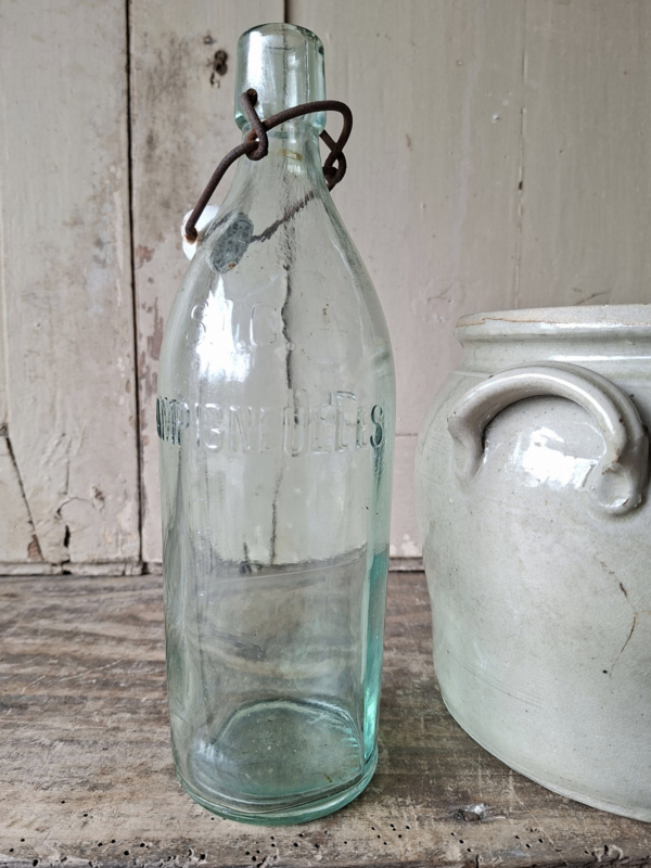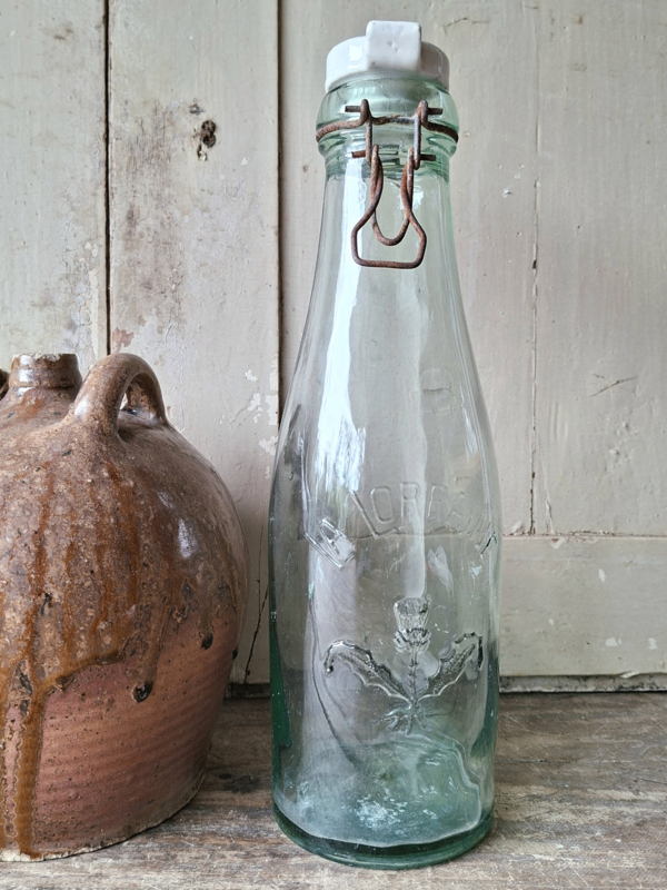 Franse GazeuzeflesOude franse gazeuzefles, limonadefles. In het glas is te lezen Champignelles, ook op de porseleinen dop is de merknaam te lezen. Deze oude flessen zijn met de hand gegoten, het maakt het karakter. De dop gaat zover open als op de…