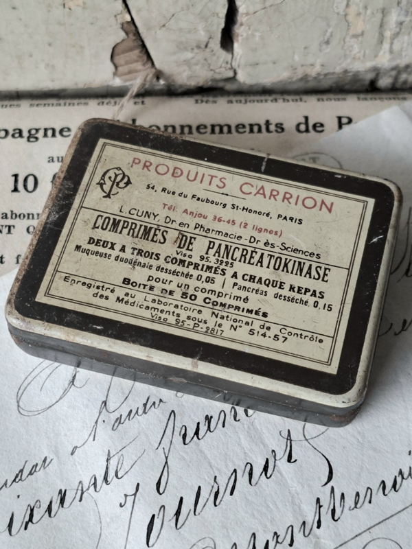 Pharmacie BlikjeOud frans pharmacie blikje van Produits Carrion, Paris. In het blikje waren ooit tabletten voor de spijsvertering. Het blikje is geleefd verouderd. Oude pharmacieblikjes zijn prachtig als decoratie.