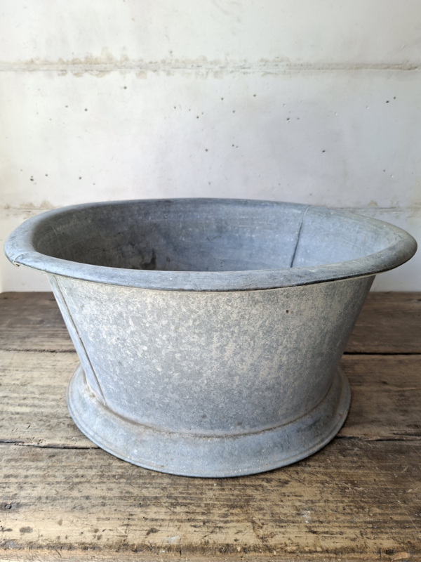 Zinken Kuip / TeilOude zinken kuip, teil. Deze heeft een vorm die je niet zo veel tegenkomt. Bijna rond en met opstaande onderrand. Het zink is verouderd en verweerd. Aan de bovenrand is de naad wat open, de onderrand is ooit over de halve lengte…