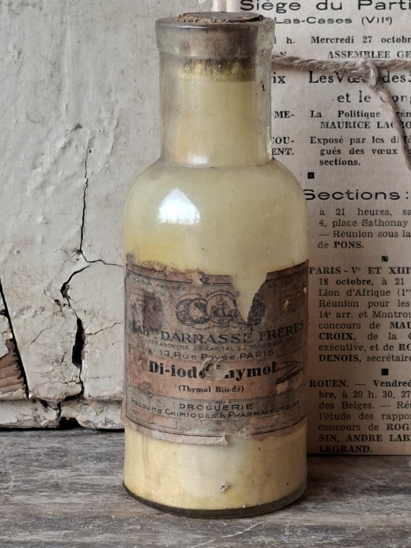 Pharmacie FlesjeHeel oud inmiddels antiek frans apothekersflesje, pharmacie flesje. Het is verouderd, het heeft het originele etiket. Het flesje heeft nog inhoud, de inhoud is onbekend en niet voor gebruik.