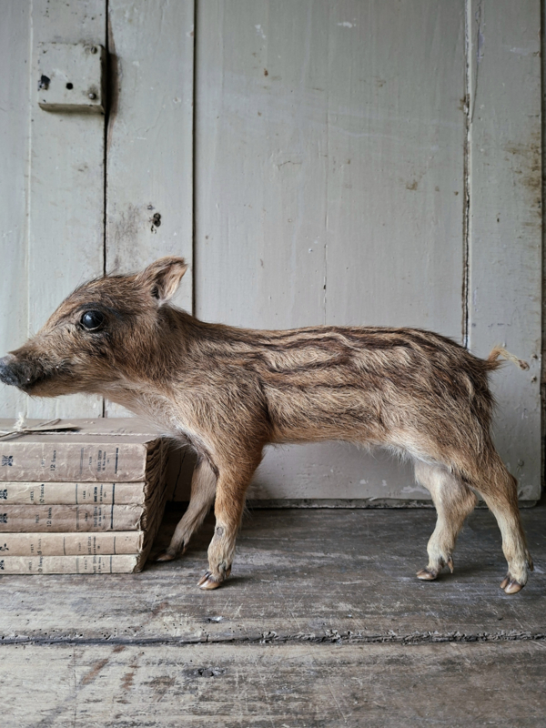 ZwijntjeKlein ouder opgezet zwijntje, frisling. Mooi opgezet en blijft staan, één pootje staat wat hoger. Aan de onderzijde bij de buik is het dichtgezet met rijgdraad. Bij het rechter voorpootje is de huid beschadigd, maar is wel…