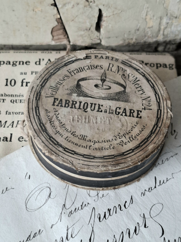 Doosje VeilleusesHeel oud frans rond doosje van Veilleuses, lontjes voor waxinelichtjes. Het doosje is door de ouderdom mooi verouderd. Op het doosje is te lezen Fabrique a la Gare, Veilleuses Françaises. Oude doosjes zijn mooi als…